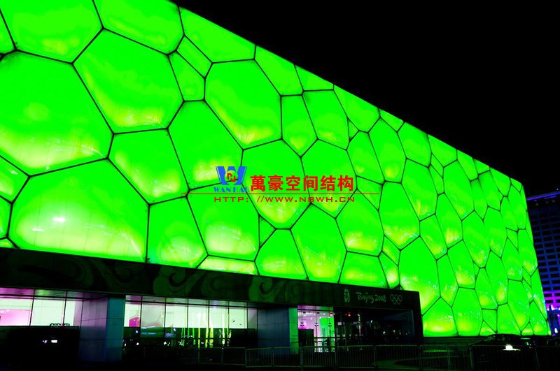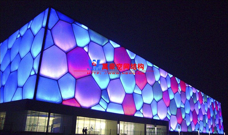 “水立方”就是一个非常典型的充气式膜结构建筑,它的外表由许多不同大小、形状、矢高的ETFE气枕组成,外层所使用的浅蓝膜和内层的镀点膜在阳光照射下让ETFE气枕出现两个高光,更加体现出了水泡的特征。这种独特的对光线控制的技术,使得“水立方”成为了世界上独特的建筑形式,展现出了前所未有的整体建筑的艺术效果。同时气枕尽管大小不同,其矢高调剖控制在12-15%的跨度之内,这样就是的整体效果此起彼伏,立体感更加的明显,建筑的表现力更加的丰富。