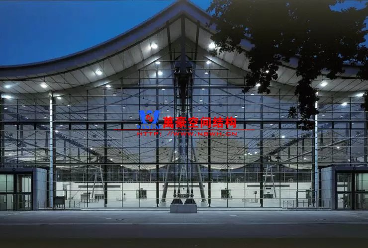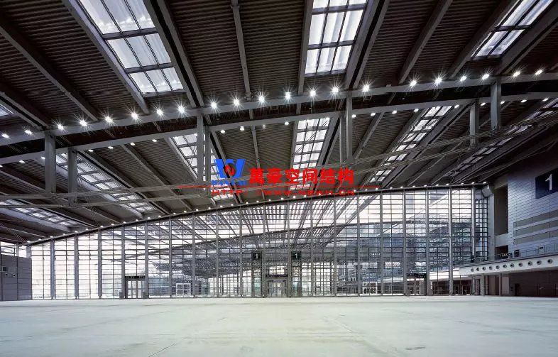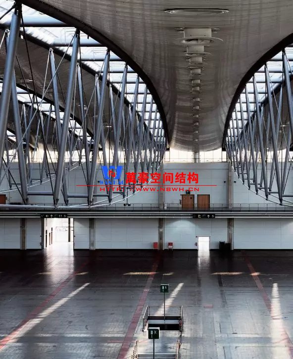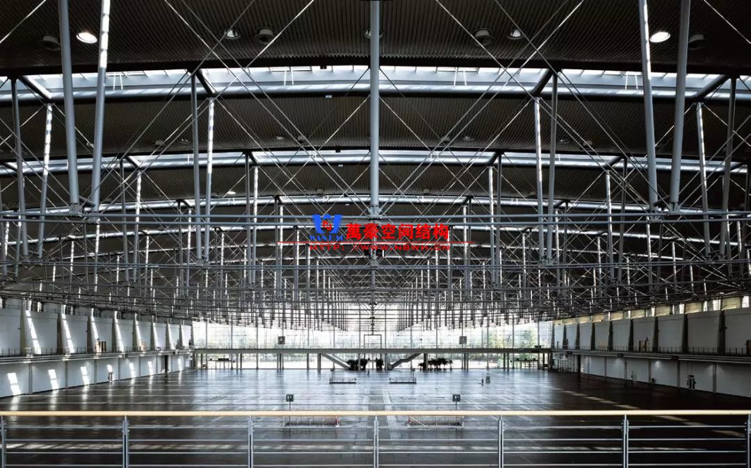 汉诺威会展中心是世界上最大、最负盛名的会展中心,超过50万m2的净展面积和每年超过50场的顶级展会,使其几十年来稳居行业龙头地位。1994年,在汉诺威会展中心4号展厅的竞赛中,德国gmp国际建筑设计有限公司(以下简称gmp)和sbp结构工程师事务所(以下简称sbp)联袂中标。展厅提供了一个通过玻璃采光顶自然采光的185.6m×116m的无柱大空间,净展面积超过21 500㎡。双层屋面结构的下层以承重金属波形板将屋顶下的设备管道保护起来,同时利用双层金属板结构之间的空腔进行正压送风,使得灰尘难以进入到空腔和管道。4号厅可以举办多种不同类型的活动,特别是容易产生灰尘的马术等。