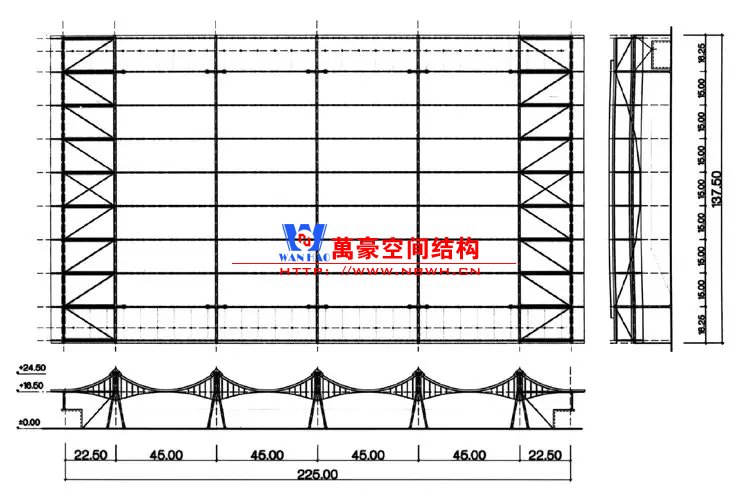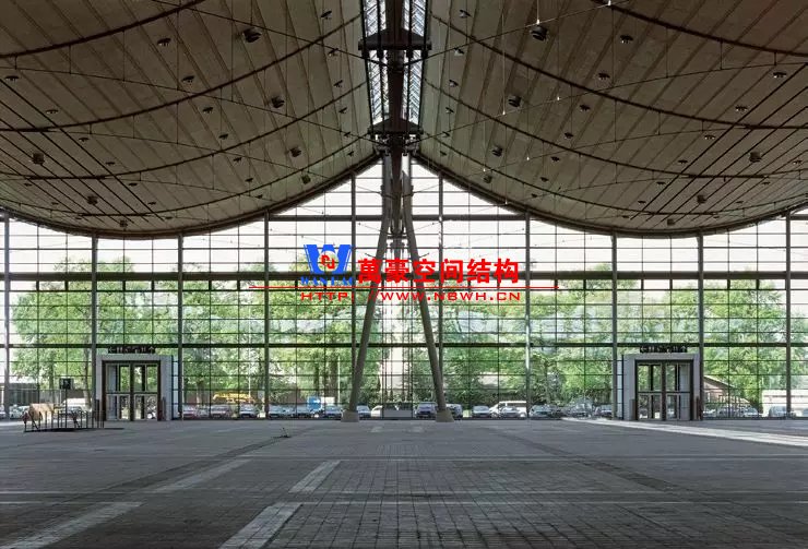 126m的跨度在2001年被誉为“中国第一跨度”。结构设计中采用了一系列措施让这个“中国第一跨度”在确保建筑意图的前提下得以高效实现。大型屋面采用下张弦体系减少钢梁弯矩,为了获得与钢箱梁匹配的刚度,下弦采用了直径最大为150mm的高强钢拉杆,这一设计也间接推动了国内自主高强钢拉杆的高速发展。施工过程中采用了先滑后固的方式释放了自重下的柱脚水平推力,减少结构内力。采用连续梁檩条,大幅度降低了30m跨度檩条的用钢量。