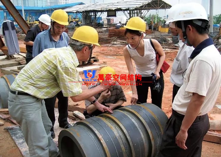 精心设计和建造的柱脚节点成为了整个项目的亮点。为了保证其转动能力和侧力传力可靠,按设计要求,柱脚铰支座的安装精确到间隙不能超过15mm,这意味着跨度126m、高26m、重约500t的钢箱梁连接在铰支座上,两边间隙只能放进两根头发丝。这些经验为后续其他项目的钢结构加工和验收提供了非常重要的技术支持。