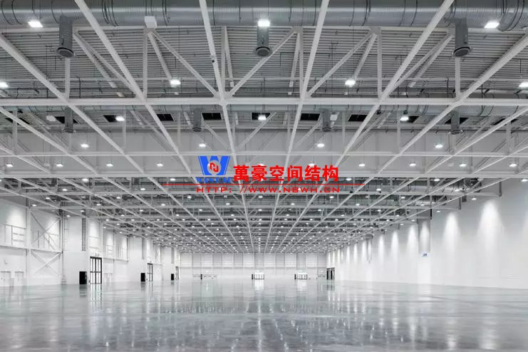 4号展厅的屋盖采用了跨度122m、高度为9m的张弦桁架结构,并支承于两侧三层高的钢筋混凝土结构墙体上。富有秩序的结构杆件有效地划分了这个巨大的无柱空间。上弦是两根直径为500mm的热轧无缝钢管,下弦是两根直径为75mm的全封闭钢绞线,与两端铰接的直腹杆和交叉索斜腹杆共同组成了索桁架体系。比起传统的张弦梁,其上弦所受的弯矩很小,从而可以采用更纤细的截面,获得结构的轻盈感和良好的经济性。