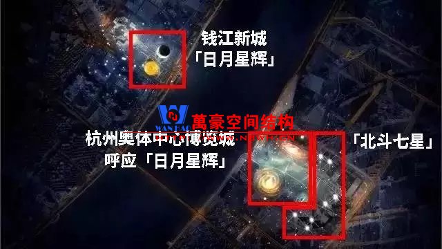 按照官方的说辞,该项目整体规划采用了中国传统的「北斗七星」意向,与隔着钱塘江的钱江新城「日月同辉」意向交相辉映。