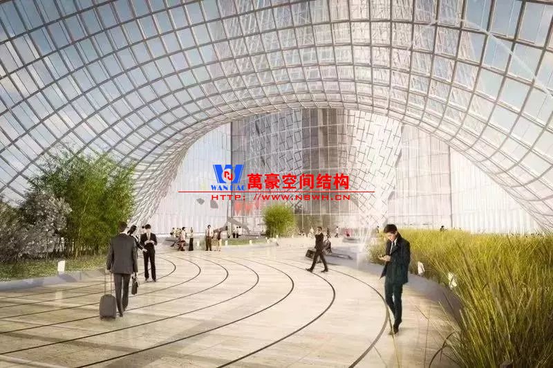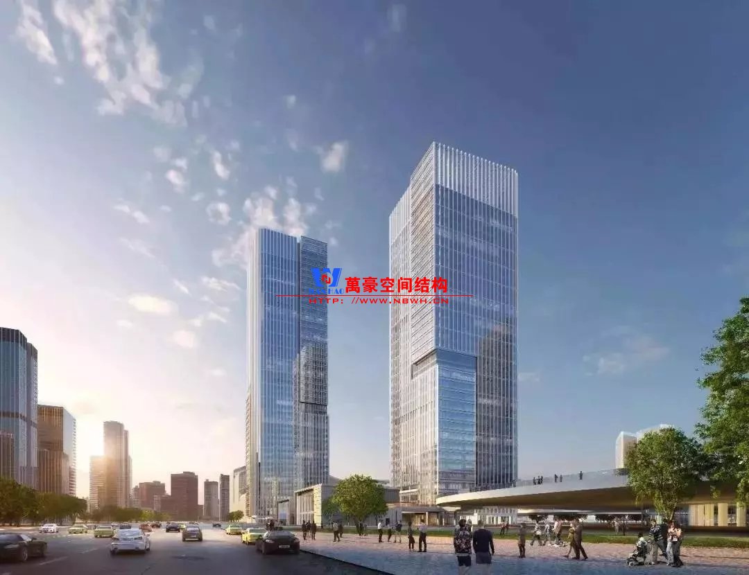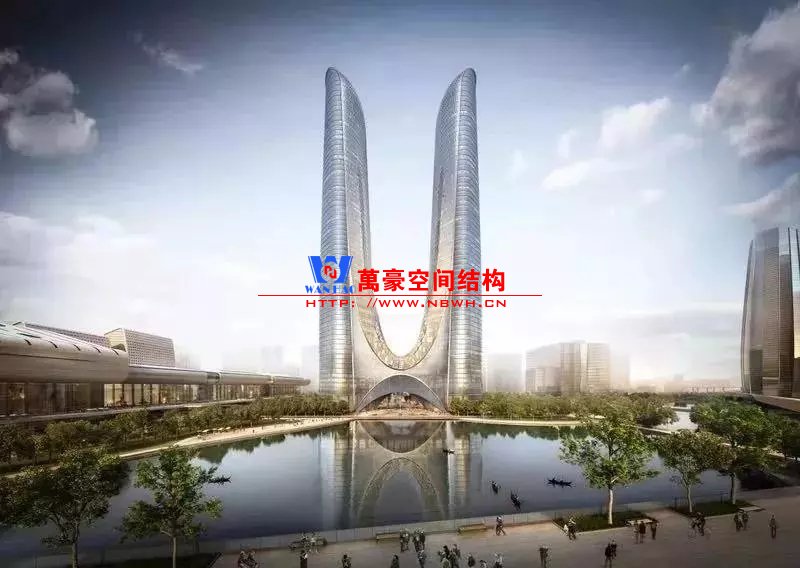 两栋塔楼之间的底部跨度约60米,中间由约22米的钢结构拱连桥相接。