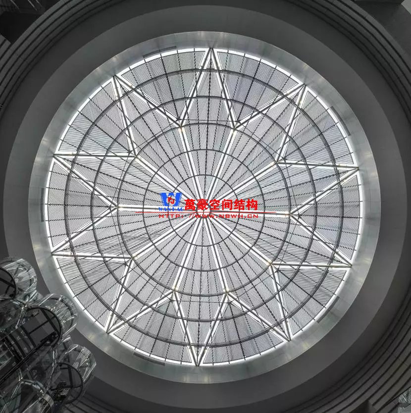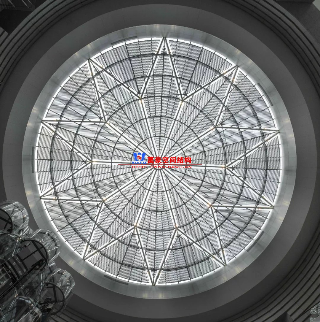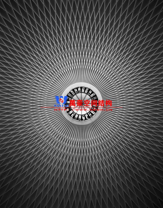 天窗位于交通中心地下一层圆形中庭上空,人流在这里交汇,在选择结构网格布置时需要考虑其向心汇聚效应,因此方向性较弱的施威德勒网格和凯威特网格就不适合。