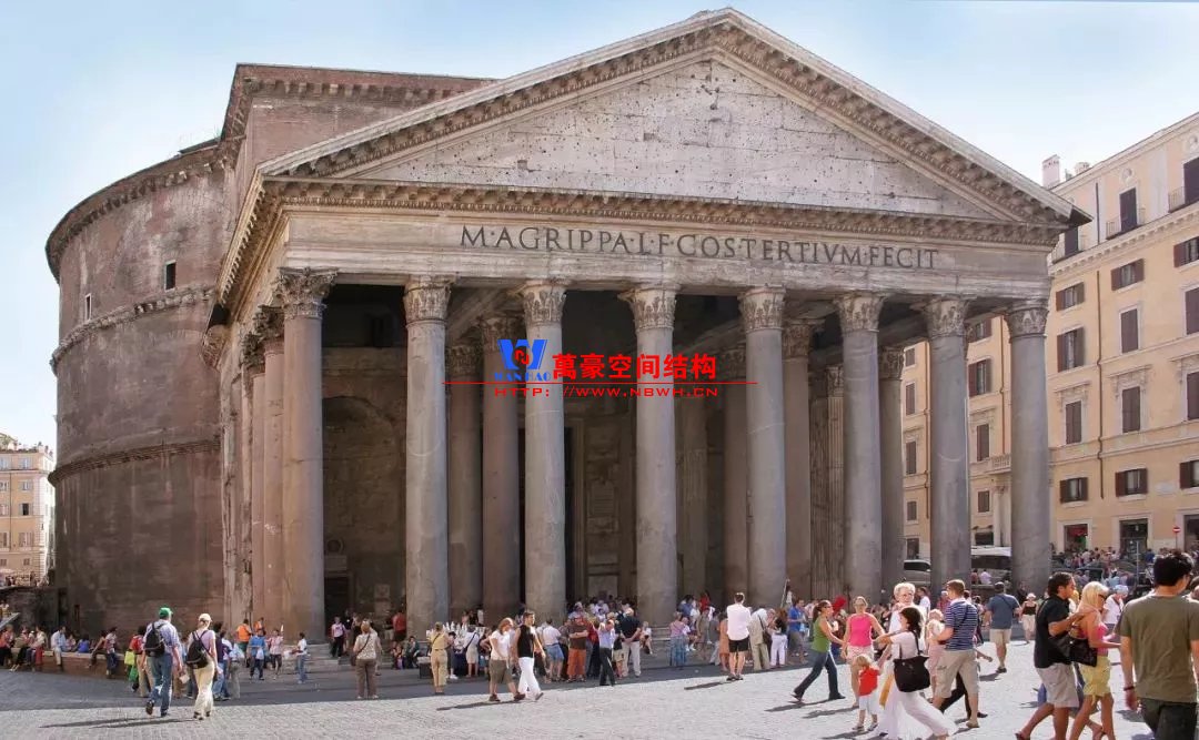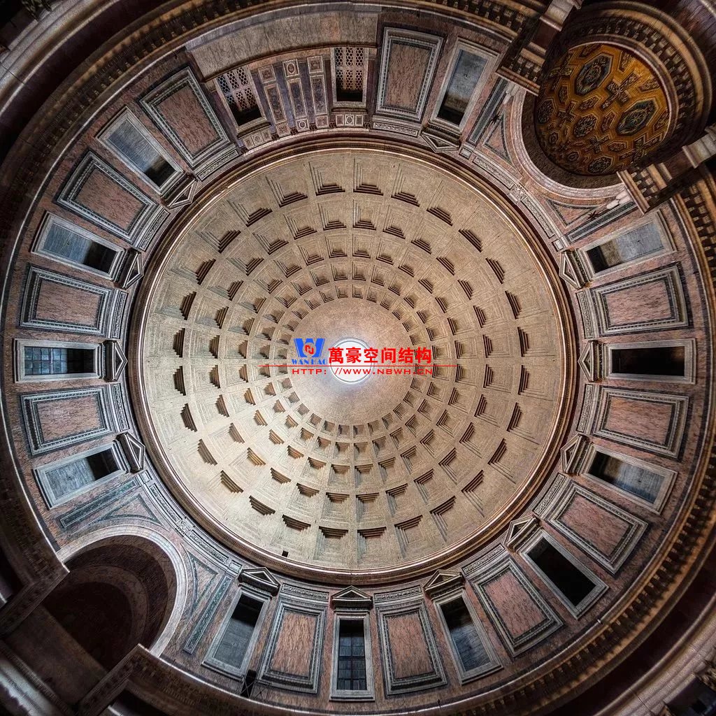 万神殿穹顶直径43.3米,最高点也是43.3米,中部采光洞口直径8.9米。穹顶采用古老的混凝土,其材料特性与石块类似,抗压王者抗拉弱鸡。而穹顶结构以受压为主,建筑材料与结构体系可谓天作之合。