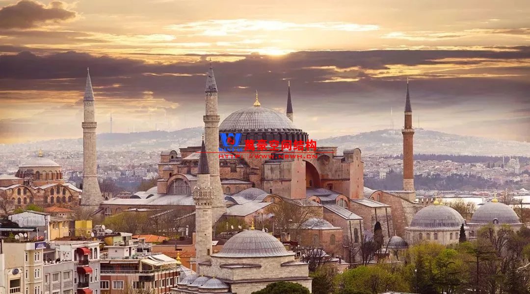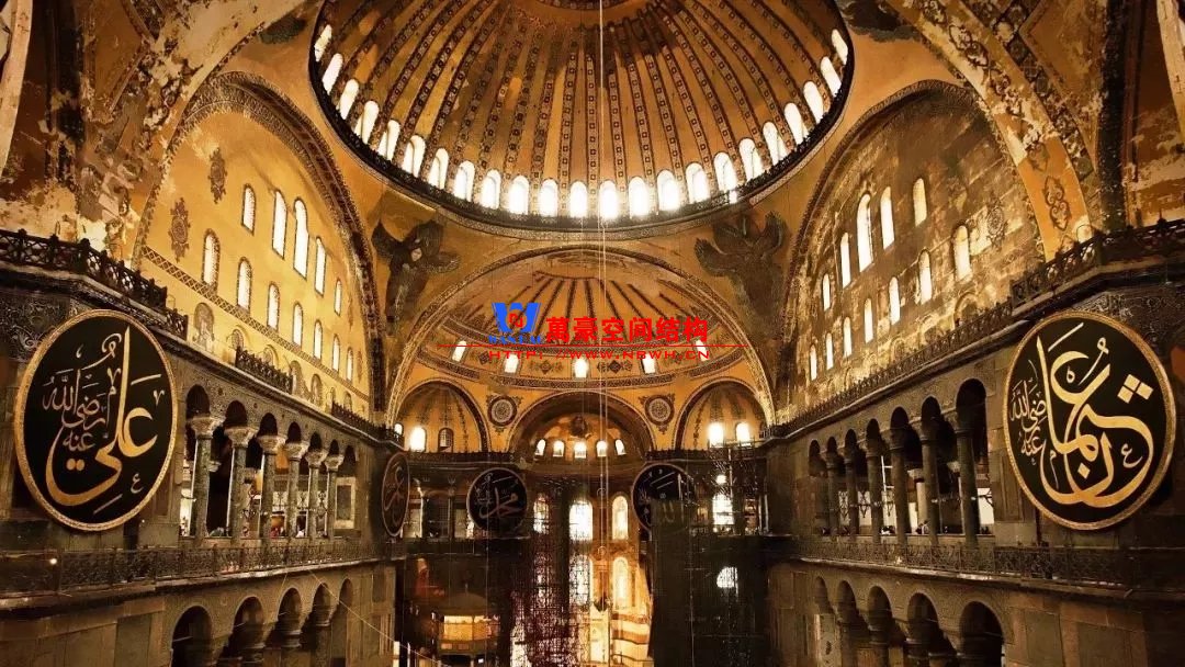 一千五百年前的圣索菲亚大教堂也因其巨大的穹顶而闻名于世。穹顶直径31.24米。这座著名的穹顶也算是命运多舛,自建成之后由于穹顶自身巨大的侧推力曾先后倒塌三次。工程师也曾试图通过增加墙厚、增设飞扶壁、增加穹顶矢高等方法加固,但依然没有结束它不断倒塌的命运。