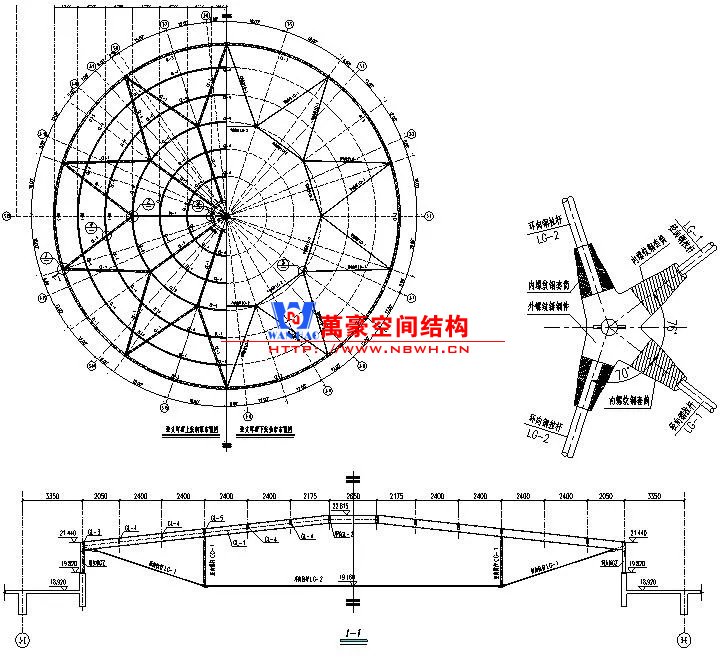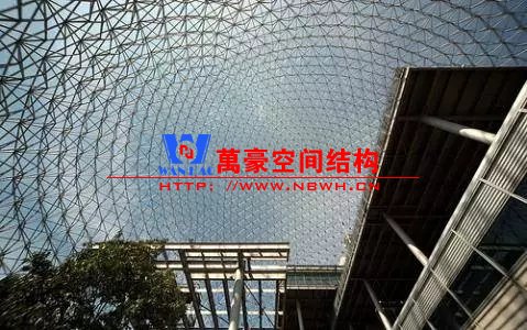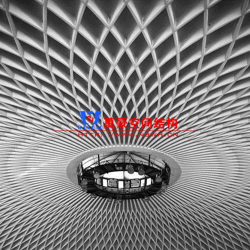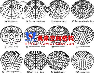还是用钢结构比较稳妥。要用钢结构表现天窗的轻盈,网壳是一个很好的选择。经典的网壳划分方法有很多,比如肋环型、联方型、施威德勒型、凯威特型等等。其中肋环型适合中、小跨度;联方型抗风抗震性能相对更好,适用与大、中跨度;施威德勒型能承受较大的非对称荷载,适用于大、中跨度;凯威特型为均匀的三角形网格,适用于各种跨度。