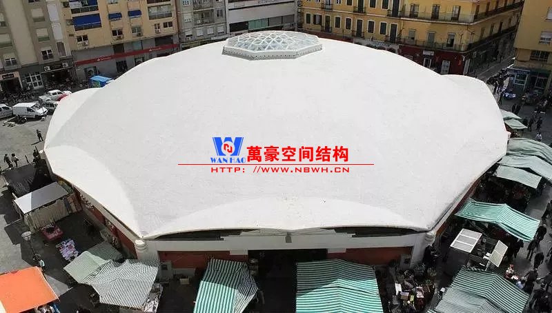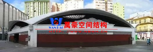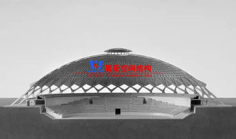 再比如托罗哈1933年在瑞士设计的阿赫西拉斯镇集市屋面。正八角形穹顶直径达47.6m,曲率半径为44.2m。作为单一的球壳,它的跨度第一次超越了万神庙穹顶。壳体厚度最小为8.9cm,厚跨比是1/535;支承点附近加厚至45.7cm。