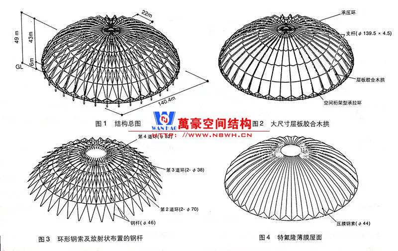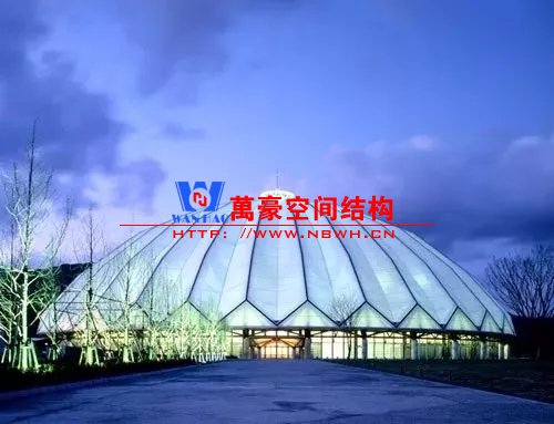 出云穹顶,球形穹顶直径143.8米,拱顶部高度48.9m米。它最大的结构特点是综合性。材料上有钢、木、薄膜;结构形式上有拱、桁架、索膜结构,并充分发挥了每个部份的优势。