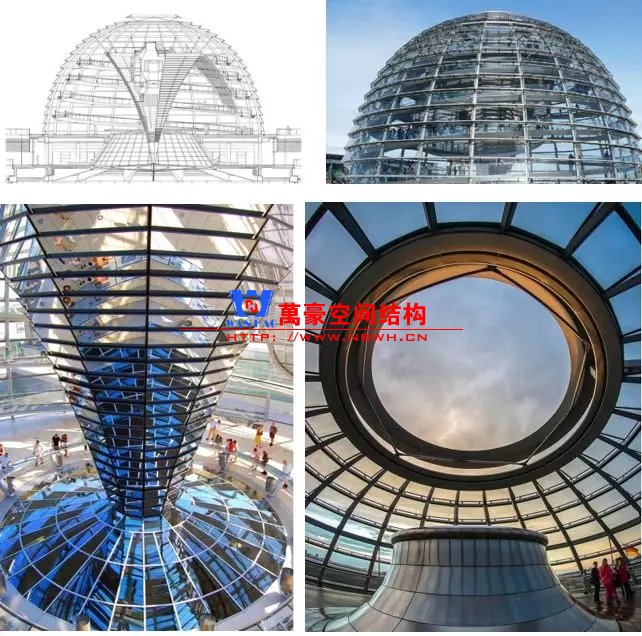 德国国会大厦改造中的穹顶即采用了肋环式网壳,中庭中部还有一螺旋式通道一直引领人们到达圆顶和瞭望平台。相对于混凝土网壳,钢与玻璃的组合通透性更好,同时也更符合密斯对于现代建筑的定义和现代人的审美标准。