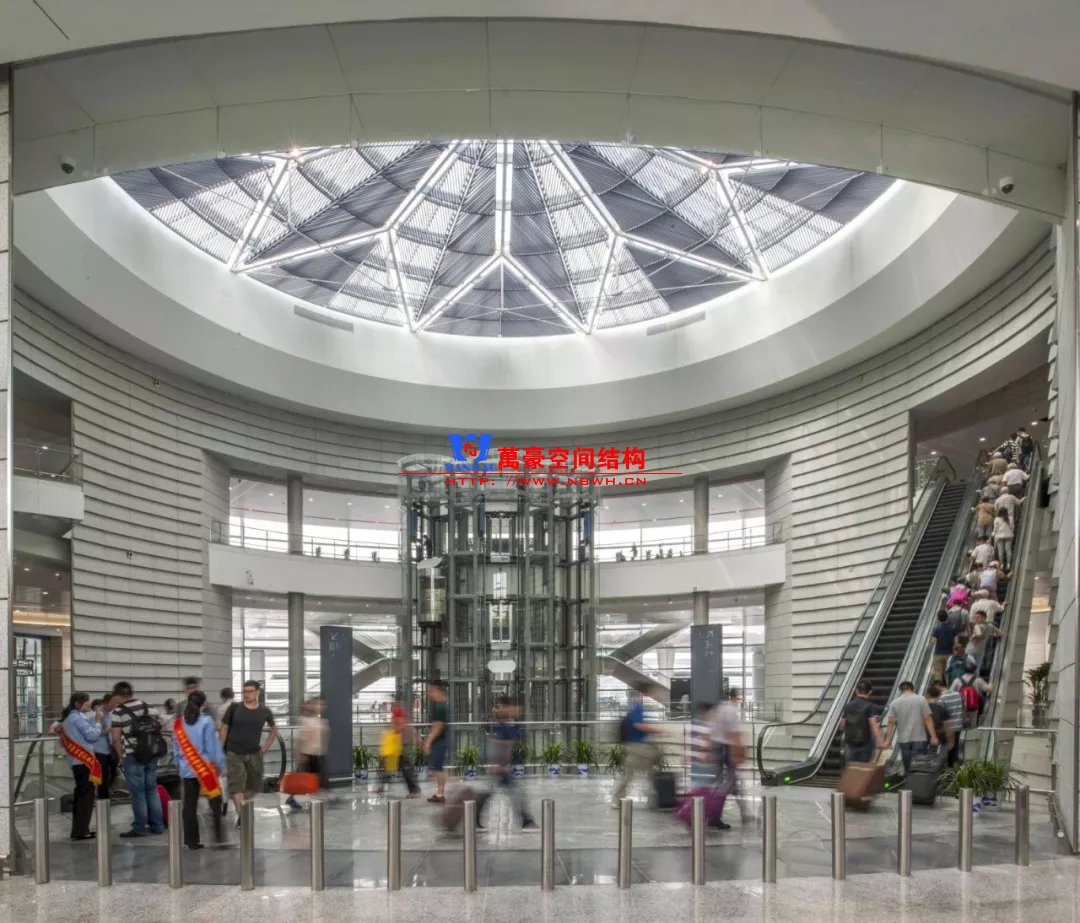这是某机场交通中心中庭的一个圆形天窗,天窗直径30米。如果让我们随便设计,有哪些方法可以填满这个圈呢,我们来看下。