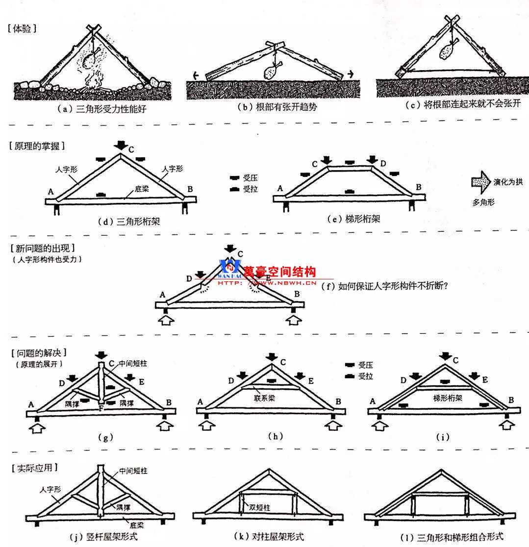 早在两千年前,人类的祖先就发现了三角形的稳定性原理,并发明了三角桁架,广泛应用在古代住房的木制屋盖中。三角桁架与梁、拱一样,是古代建筑实现跨越的最主要方法。