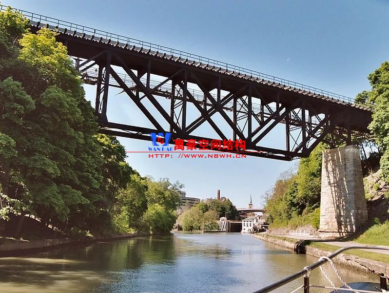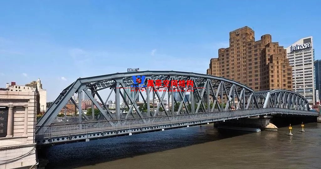 位于上海的外白渡桥是中国的第一座全钢结构铆接桥梁,于1908年1月20日落成通车。该桥为下承式简支钢桁架,两孔跨经组合各52.12米,桥面铺设电车轨道。