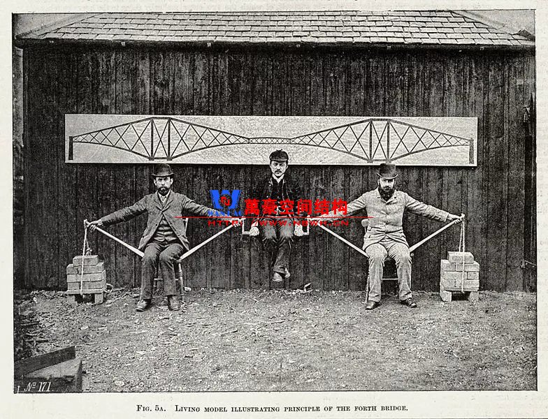 为了市民解释悬臂桁架桥梁的原理,工程师做了一个简易的示范试验,以手臂作桁架拉杆、钢棒作压杆,两人坐在椅子上很轻松地托起中间跨的重荷载(简支桁架段)。图中的三人分别是大桥的设计师JohnFowler、BenjaminBaker和工程指挥渡边嘉一。