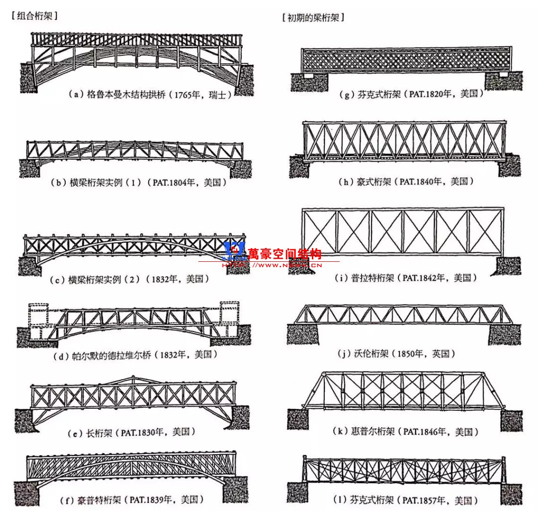 拱桥在均匀荷载下的承载力很大,但在火车的移动不均匀荷载下则产生很大变形。因此木桥普遍采用拱桥和增强刚架结合的形式。经过多次实践发现,只要把补强刚架做得足够坚固,甚至可以省去拱。于是各种新式的桁架纷纷出现,梁桁架的时代从此开始了。