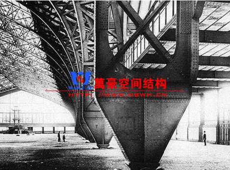 巴黎世博会机械馆由工程师J·B.Krantz和埃菲尔Eifel设计,于1867年建成。它采用钢制三铰拱,拱截面为桁架格构形式。共有20榀这样的钢拱,形成宽115米、长420米,内部毫无阻挡的庞大室内空间。