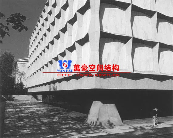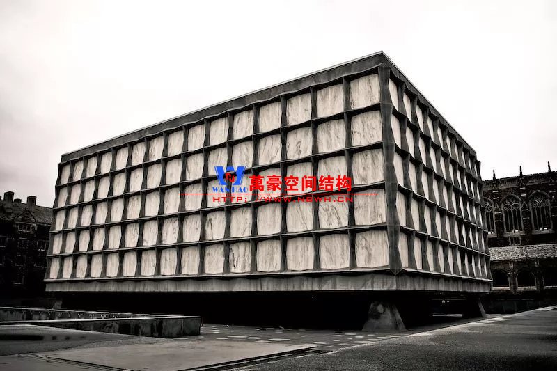 耶鲁大学善本图书馆采用了多层空腹桁架。建筑上部五层整体构成空腹桁架由四角的柱墩支承,建筑首层全部架空。