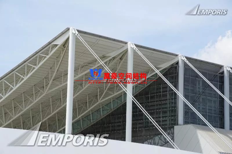 桁架横断面呈三角形,桁架最大高度8.2米,宽10.7米,由直径305~508mm的钢管组成,杆件间采用相贯焊节点。鱼腹式空间桁架首尾铰接,两端的平衡悬臂桁架为平面结构。