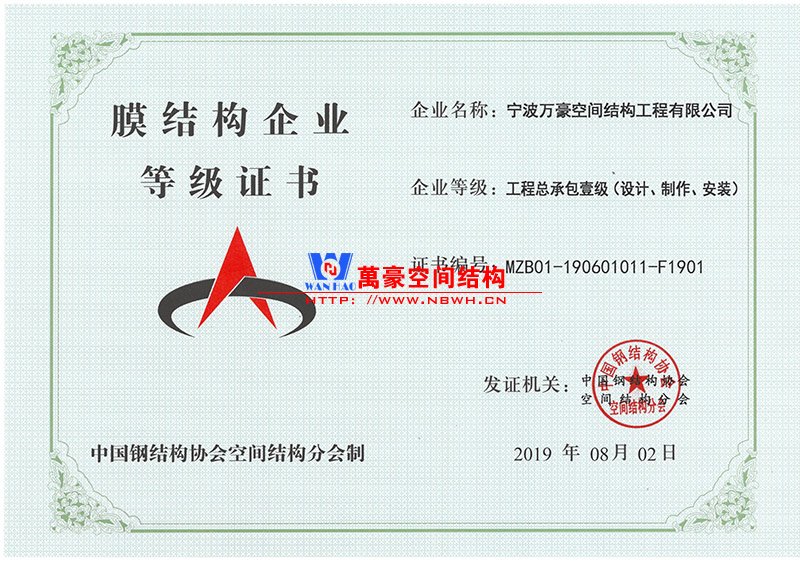 膜结构行业目前拥有的最高资质是膜结构设计一级资质和膜结构承包一级资质。同时拥有这两个资质的膜结构公司,其实力是得到行业协会认可的,做出来的工程质量自然有保证。万豪不但拥有这两个一级资质,还拥有钢结构三级资质,这意味着什么呢?这意味着与膜结构相关的钢结构,万豪有能力一并处理,配套加工出来的膜结构与钢结构,自然更有质量保证。