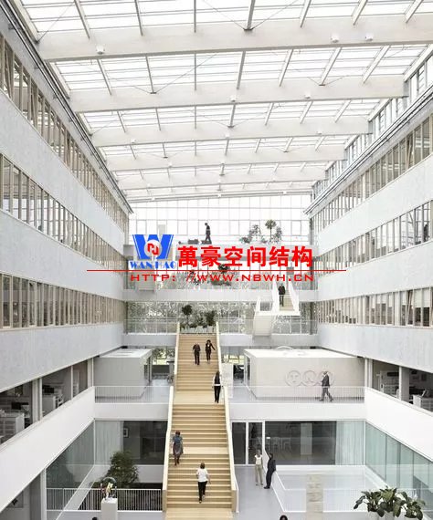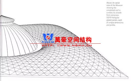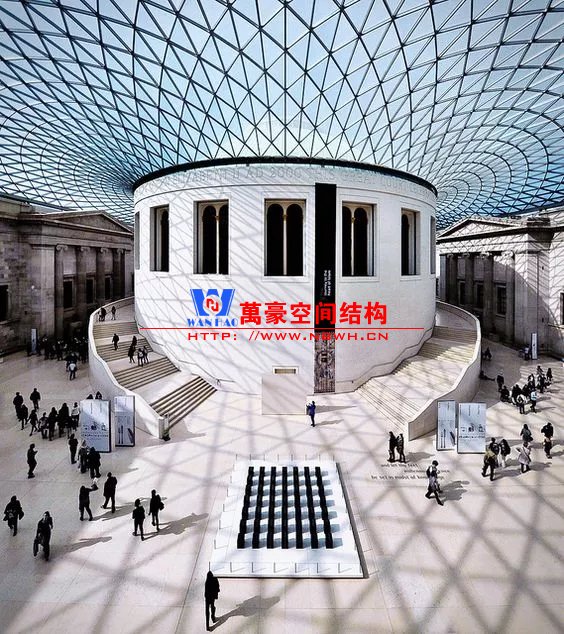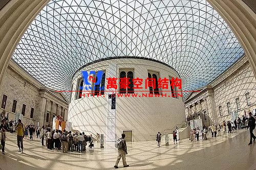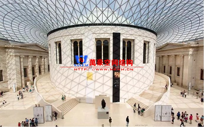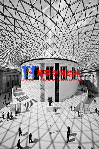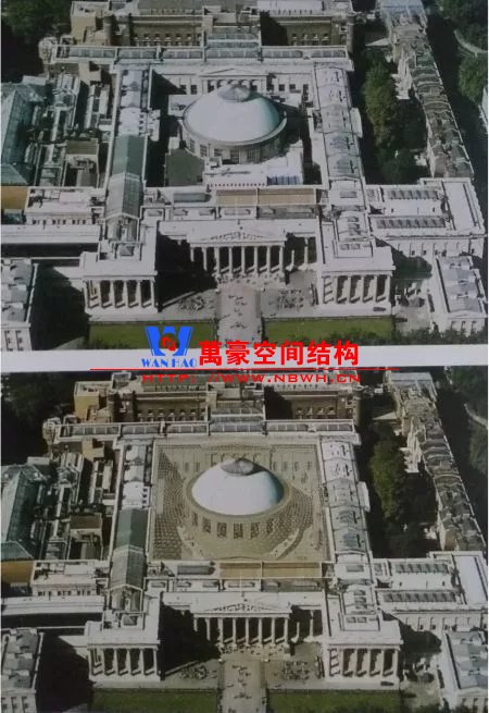 这个经典的改造项目把轻与重巧妙组合。钢结构网壳内侧支承于圆形阅览室,外侧支承于方形博物馆建筑的内墙,通过找形分析得到一个拱起的规则形态。