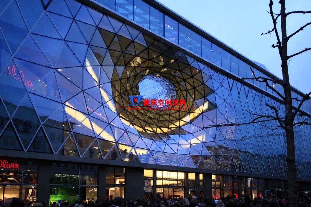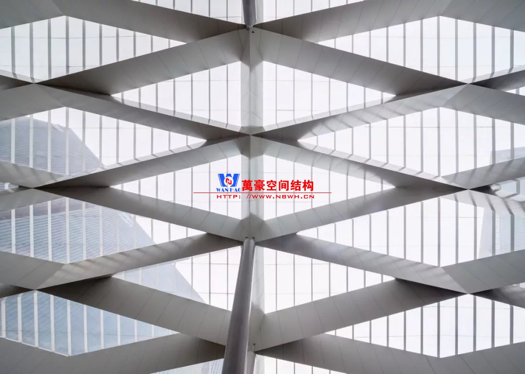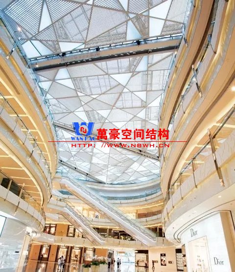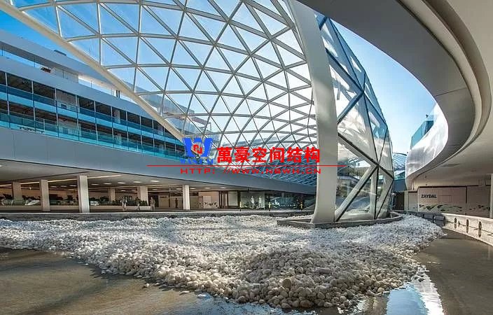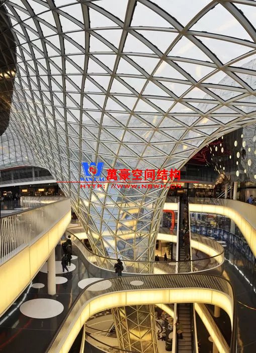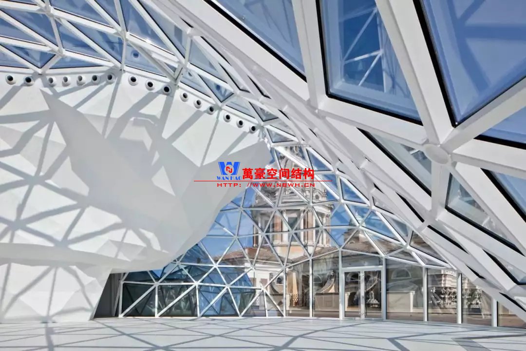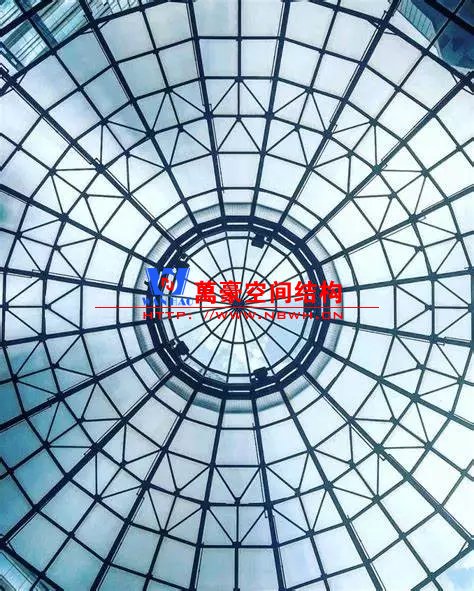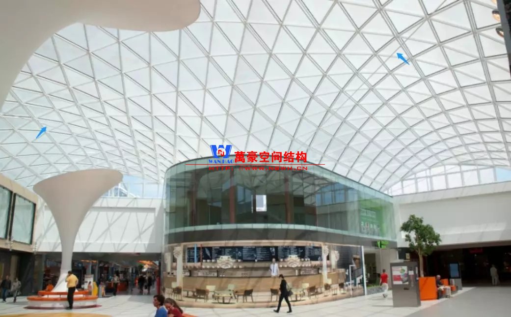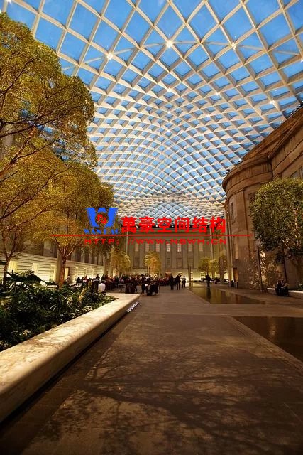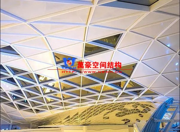 对于跨度比较小的天幕,采用单向梁或交叉梁即可实现。这一类天幕的结构创新主要体现的网格布置、截面形式和节点细节方面。例如,网格布置可以是三角形、四边形、联方形、六边形等等。