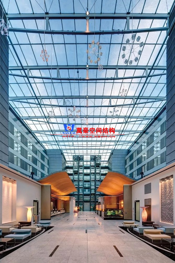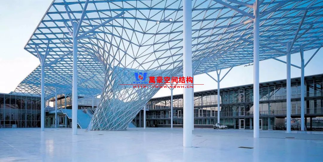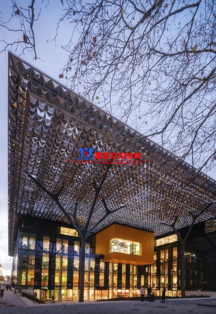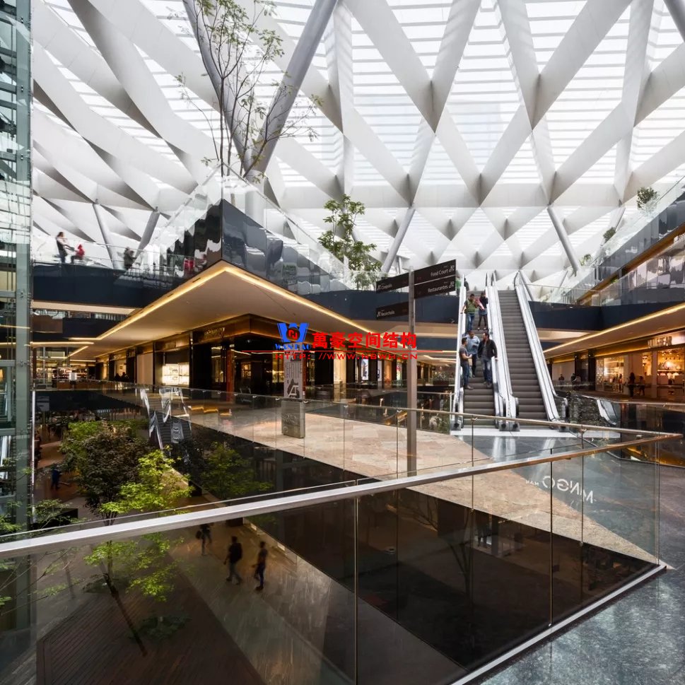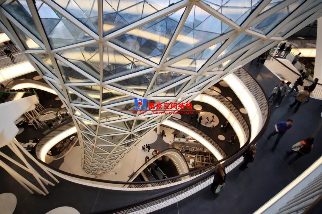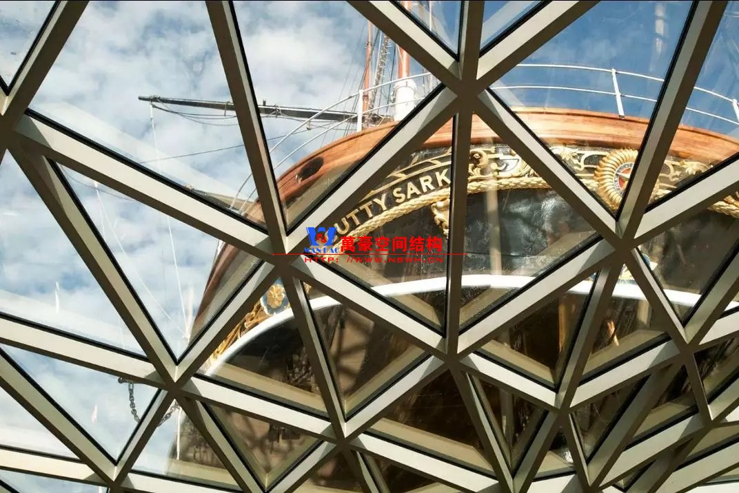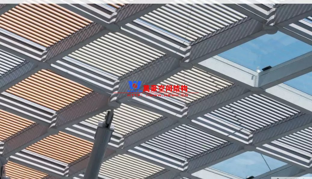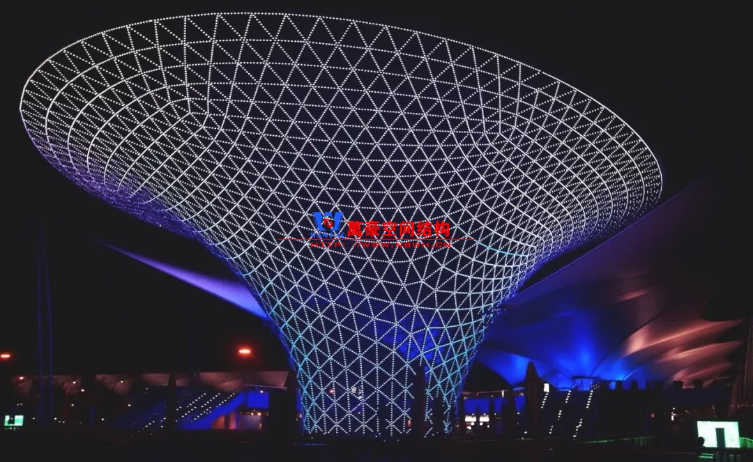 对于跨度比较小的天幕,采用单向梁或交叉梁即可实现。这一类天幕的结构创新主要体现的网格布置、截面形式和节点细节方面。例如,网格布置可以是三角形、四边形、联方形、六边形等等。