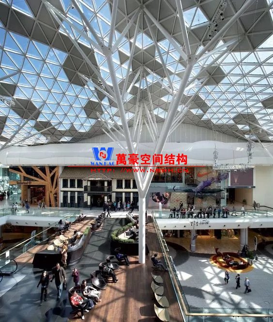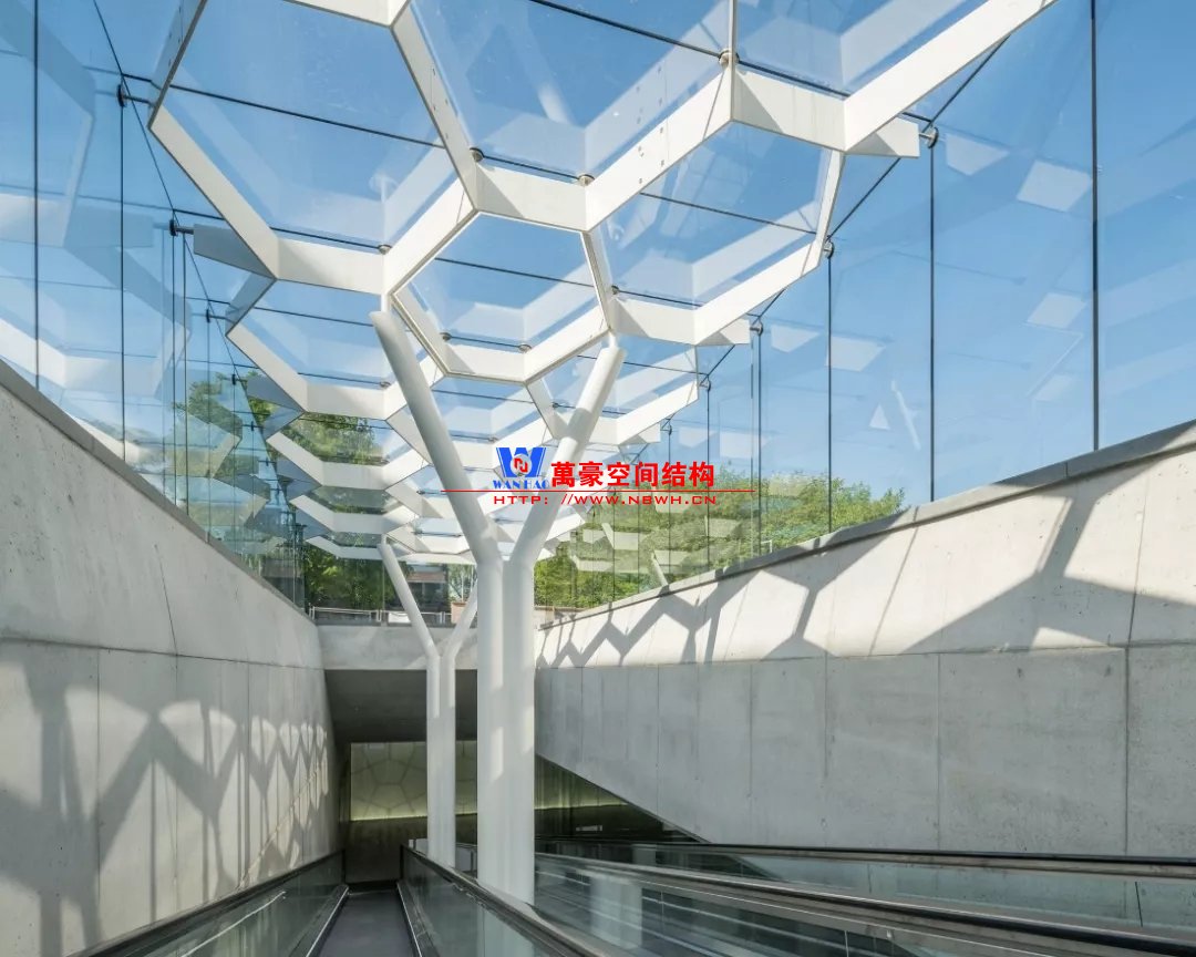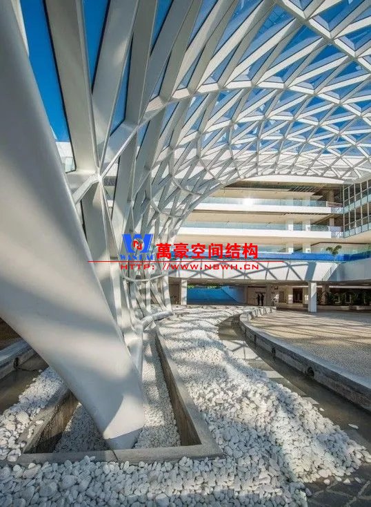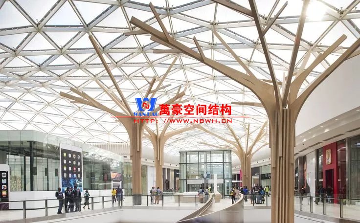 有的天幕虽然设计为曲面,但其曲面形状的力学性能差,结构受力仍然以抗弯为主。这类曲面天幕结构与树形柱相结合,才能以较细小的结构构件完成。