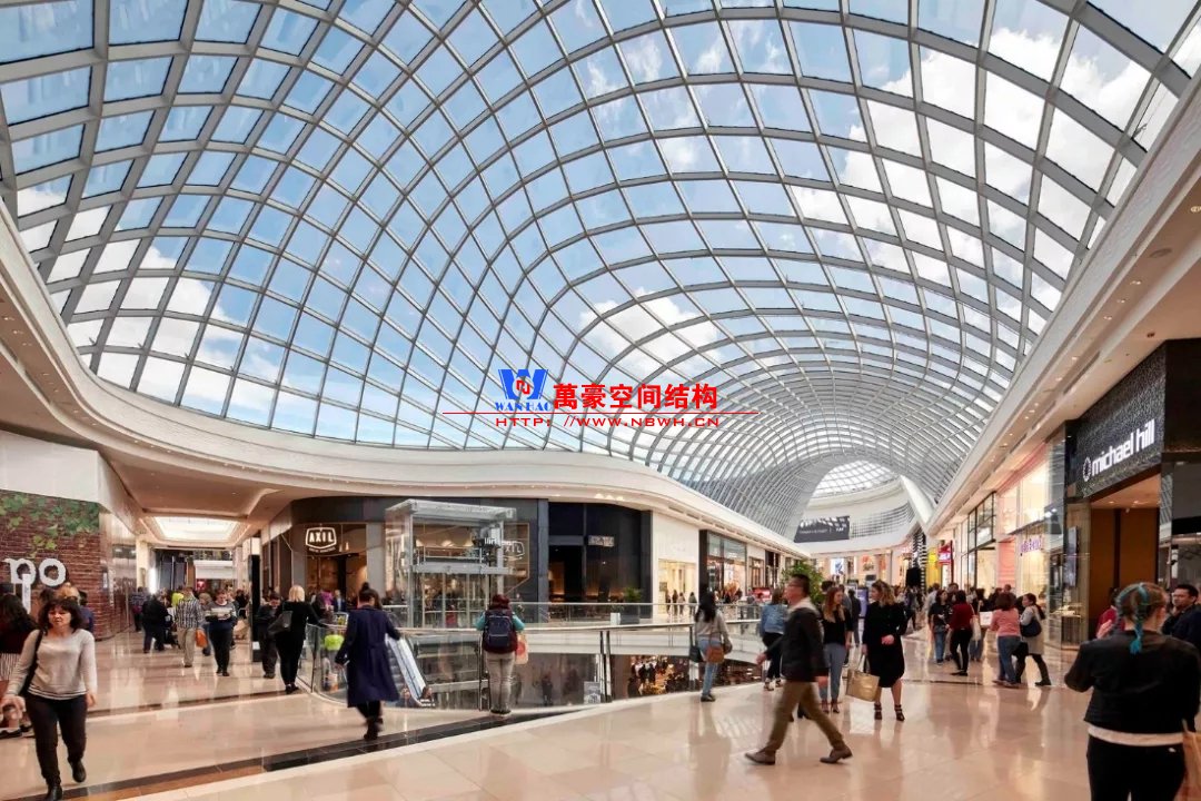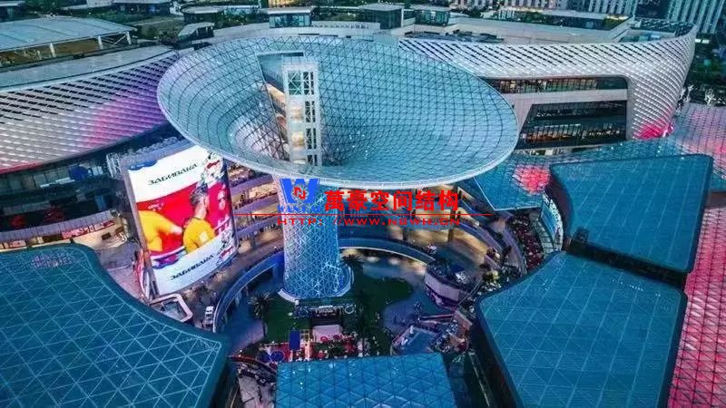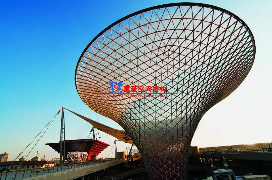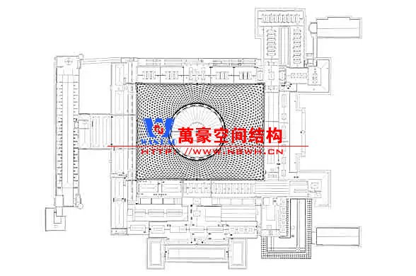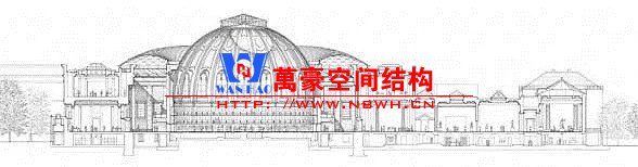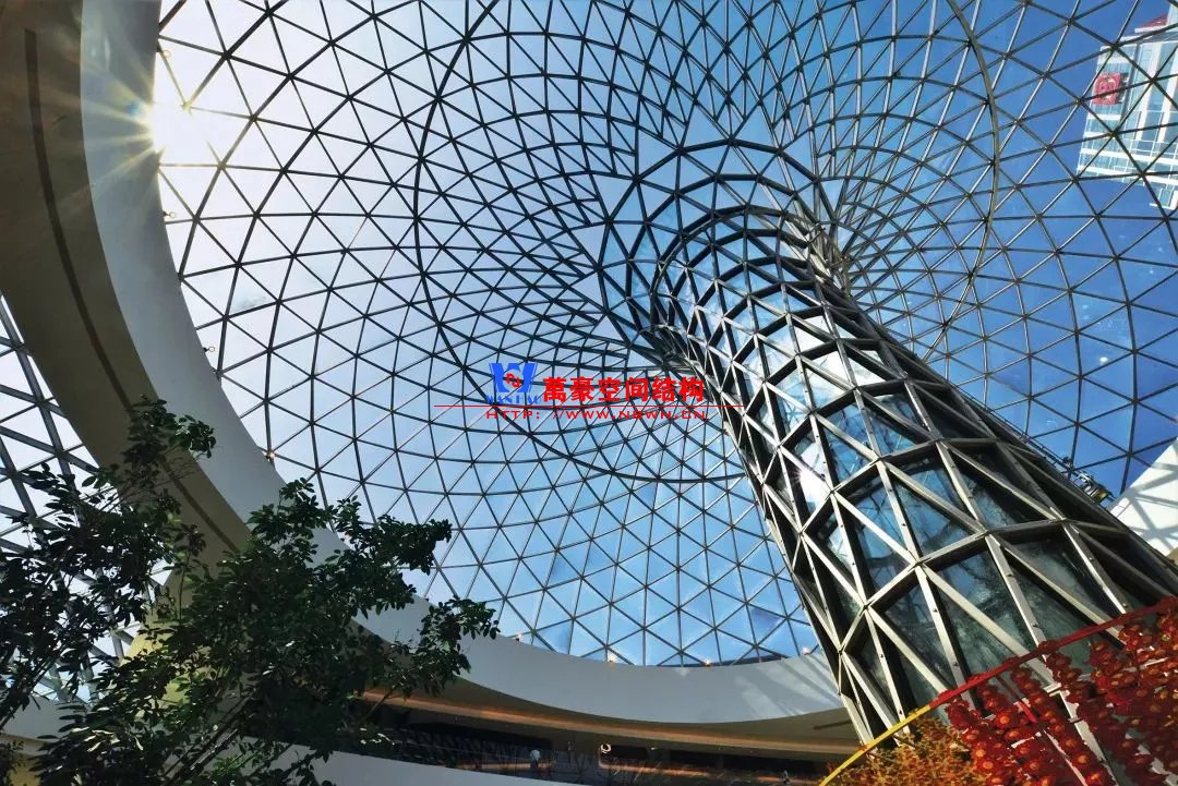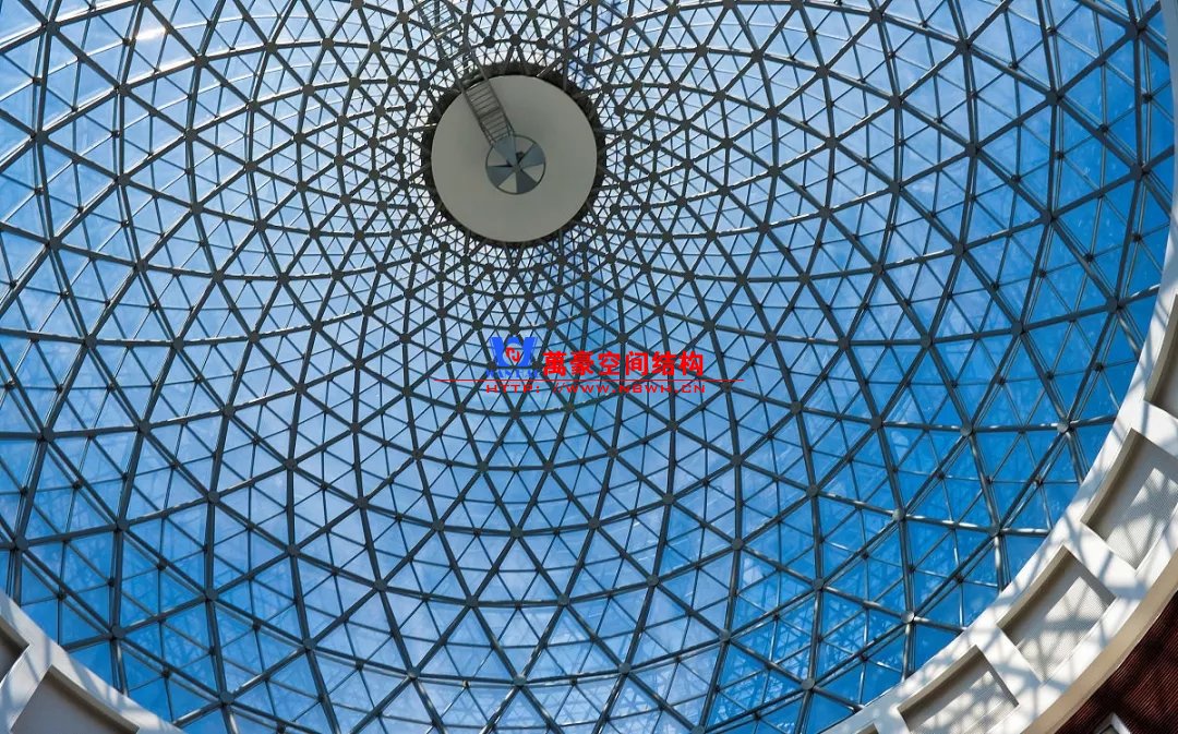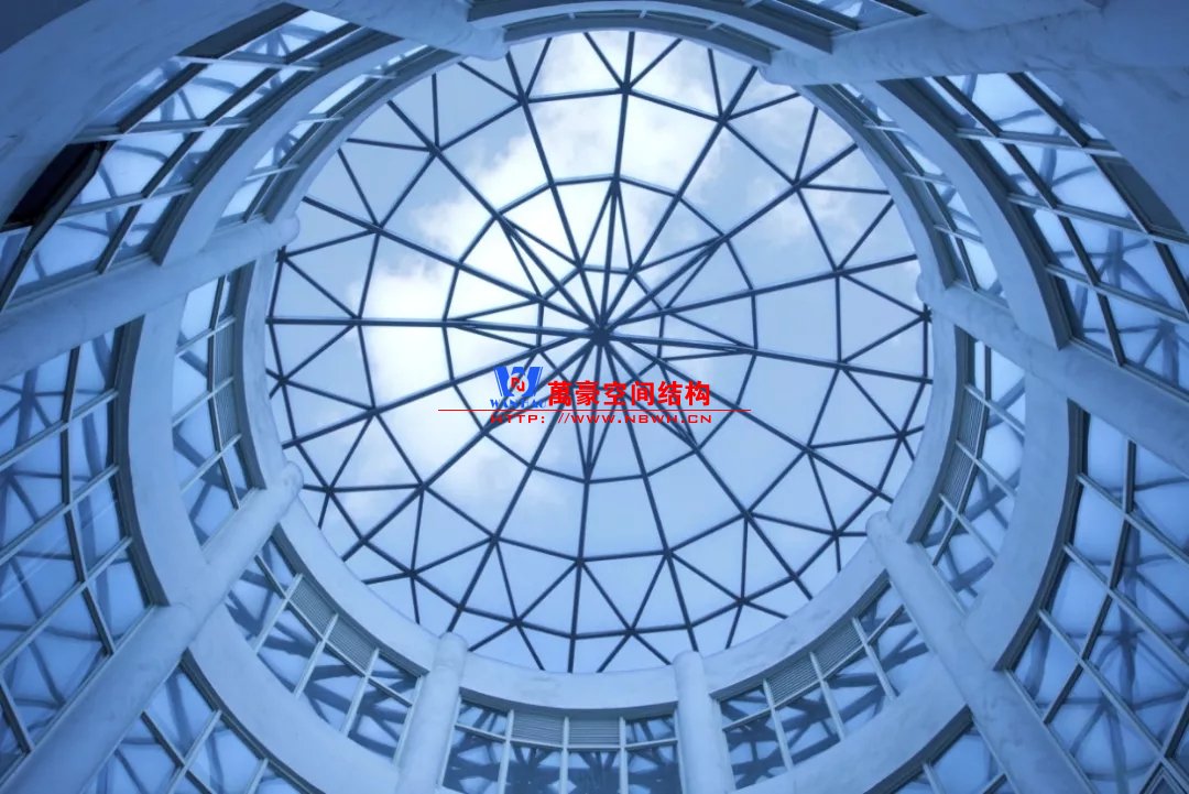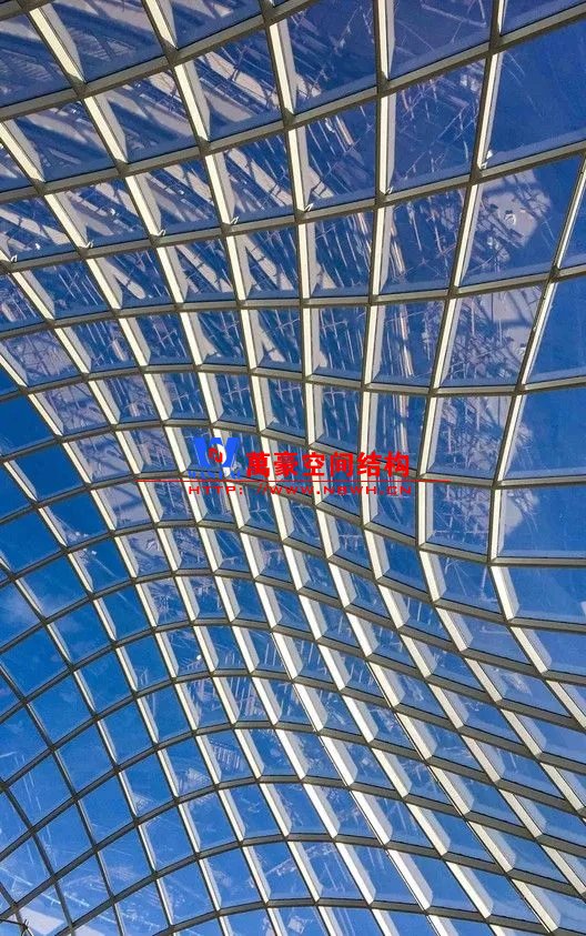 规则曲面的天幕一般采用钢结构网壳形式,利用网壳曲面的形抗原理,结构以轴向受力为主、效率高,以较小的截面尺寸即可实现很大跨度。这一类网壳曲面多为圆柱面、球面。