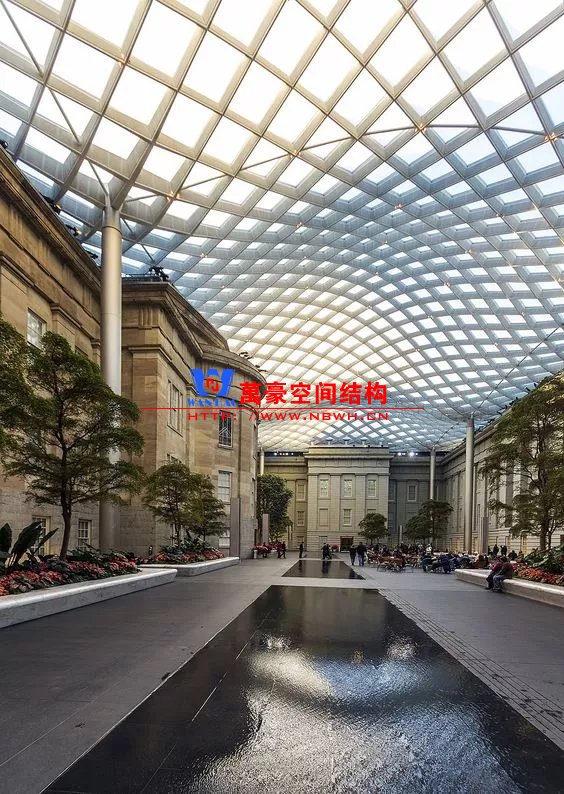 原有博物馆建筑为天幕提供了一个坚固的边界条件,使得网壳可以充分发挥形体的作用。构件以轴力为主、截面纤细,极大地突出了整体通透明亮的建筑效果。