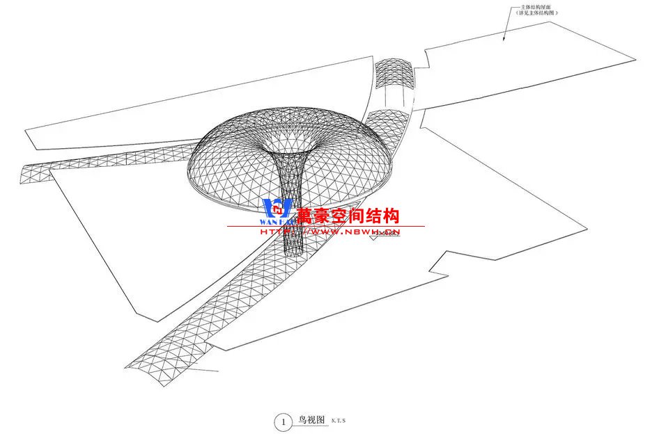 沿中心圆径向布置主受力网格,再辅助另两个方向的圆弧线条划分出1656个三角形平面玻璃板。