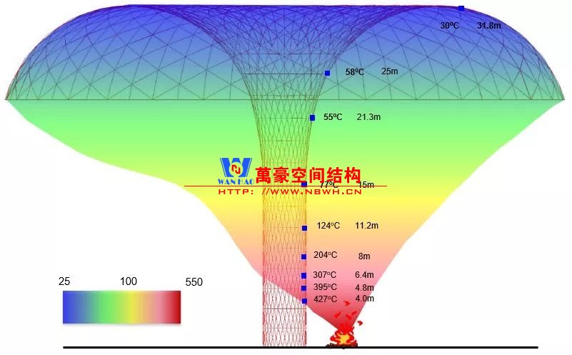 根据消防规范,中庭钢结构要涂防火涂层以提供1.5~3小时的耐火保护。通过性能化分析,设计师提出创新的水帘保护系统作为钢材防火替代方案。水帘经由气化,可以吸收火与烟雾大部分热量,使钢材表面温度显著降低。