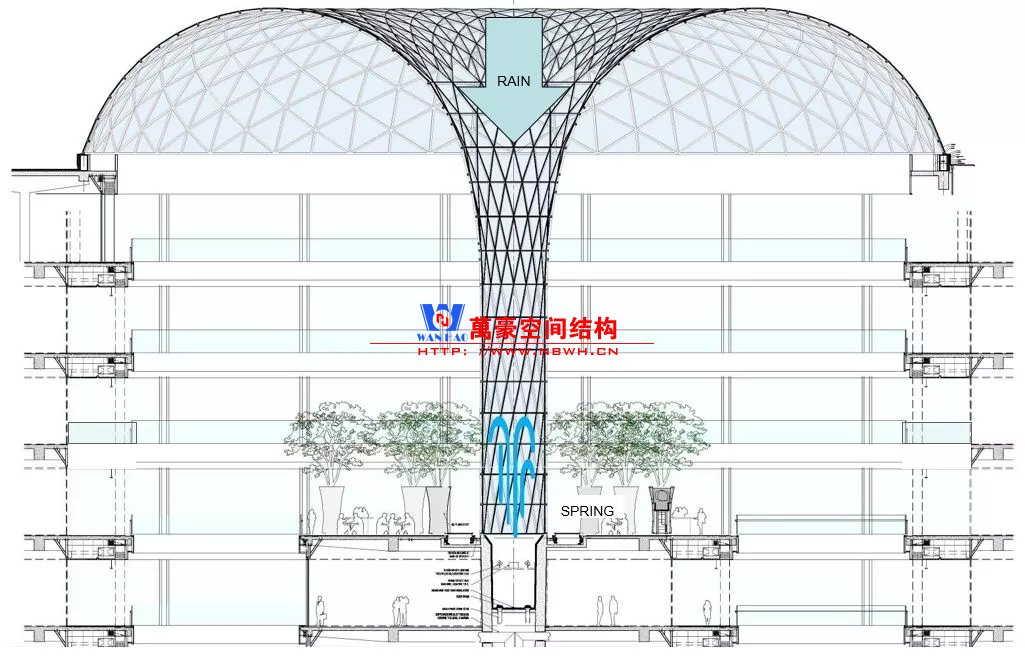 巨大透明天幕能增强自然采光和视觉通透性,然而另一方面,也带来眩光和太阳热辐射增加等潜在问题。因此,设计师采用低辐射镀膜玻璃、通风装置和气帘、雨水收集系统等兼顾了访客的最佳舒适度和绿色生态品质。