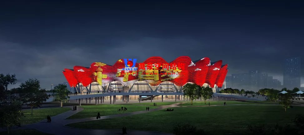 体育场夜景泛光设计突出表现建筑形态石榴花绽放的姿态和丝绸舞动的韵律,通过灵动的曲面穿孔幕墙,将灯光与之充分结合,立面利用穿孔板幕墙结构安装定制化的LED点光源灯具,屋面结合阳光板的透光特点及曲面金属幕墙,形成像素媒体建筑表皮,展现丰富的动态效果;局部立面补充投光灯具表现建筑结构的起伏转折,展现建筑形体美;灯光效果分为不同模式场景组合开启,通过灯光打造出宏大激荡的动态多模式夜景效果,让建筑动起来,让主场会说话。