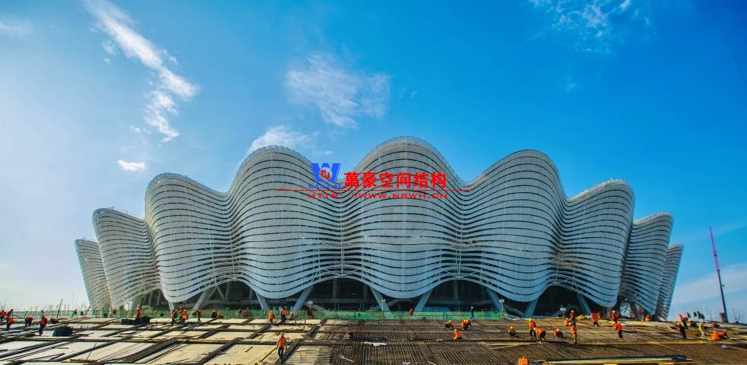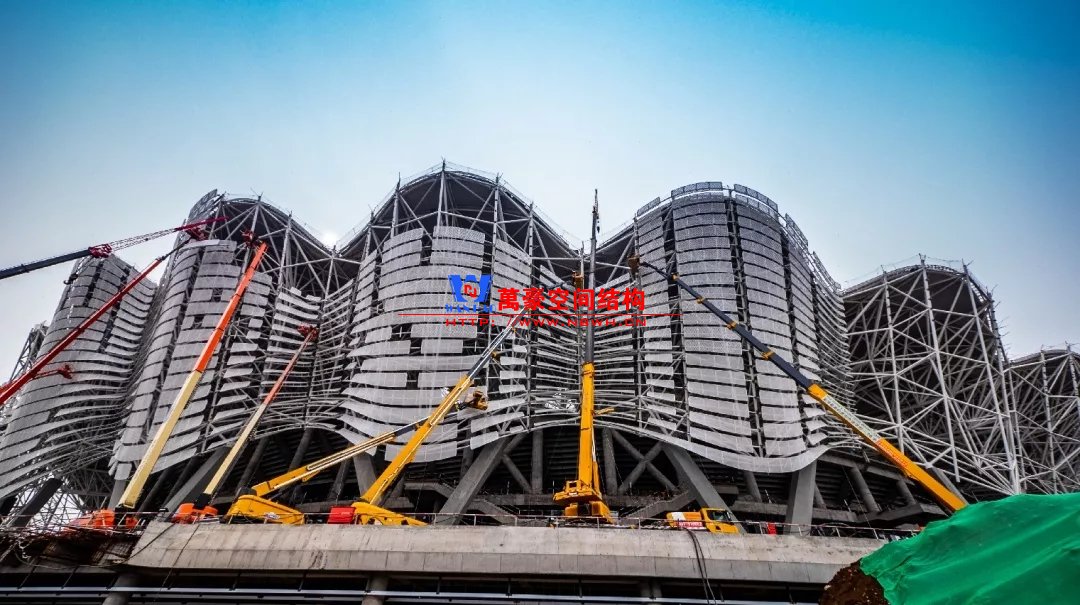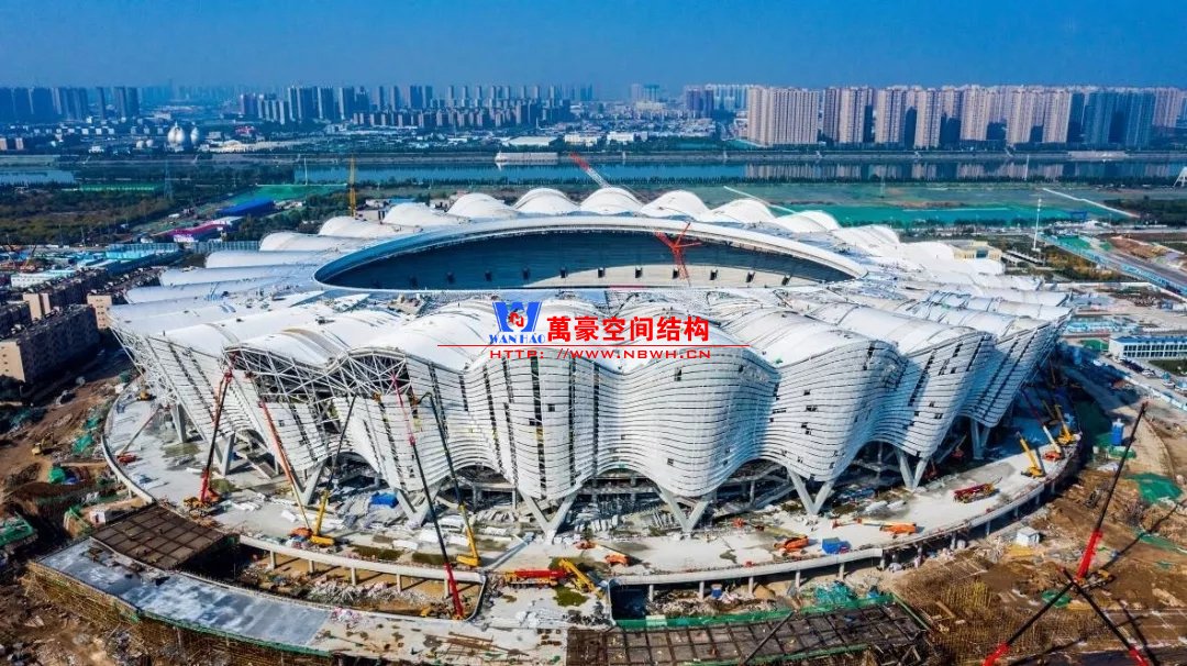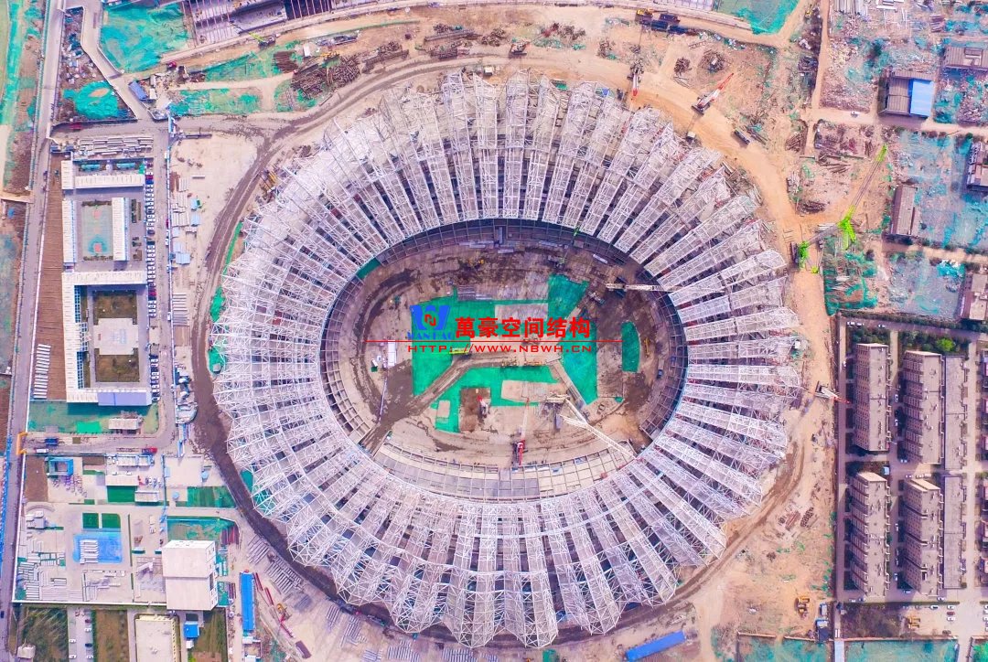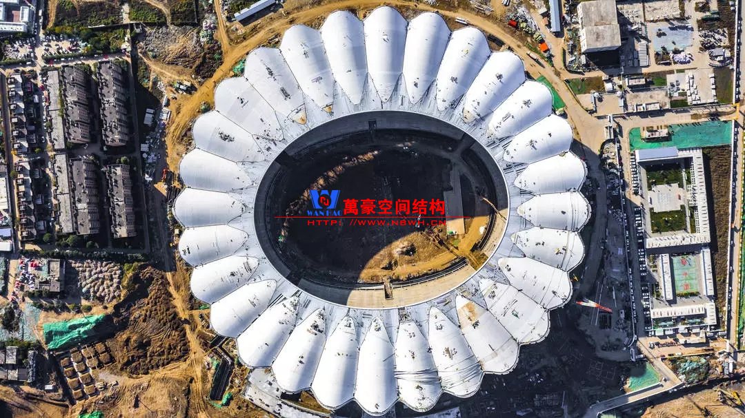 体育场罩棚铝板幕墙由16464块,近22000㎡不规则弯曲铝板拼接而成,支撑系统由3528根双曲钢环梁和16464支T型连接件构成,施工单位北京江河幕墙公司,全力拼搏,力保节点,攻艰克难,采用全站仪进行三维精确定位,共计49392个定位点,10个拼装班组历时106天,现场完成3528榀组装单元;吊装班组耗时86天,高空打点定位共计3528个,逾35台登高车(其中58m登高车7台),14台汽车吊,累计完成3528吊,于11月30日实现外立面呈现。
