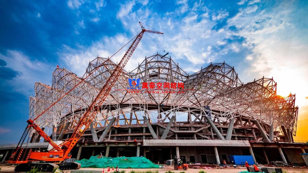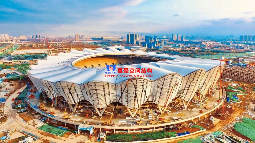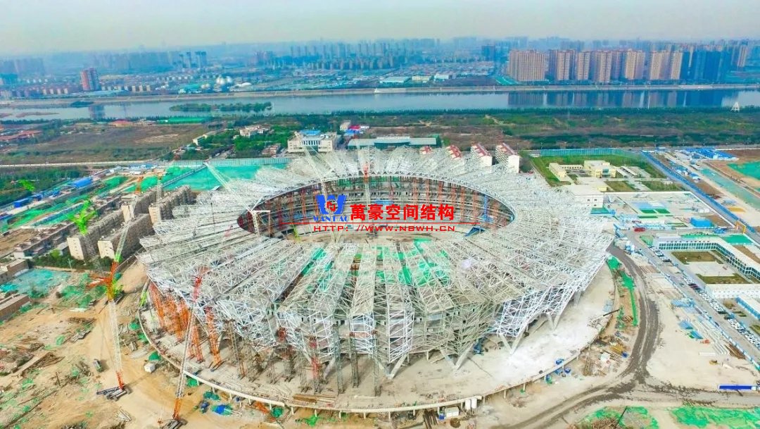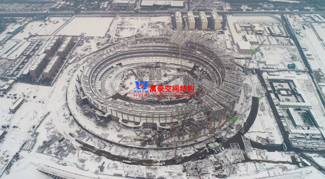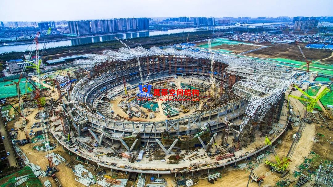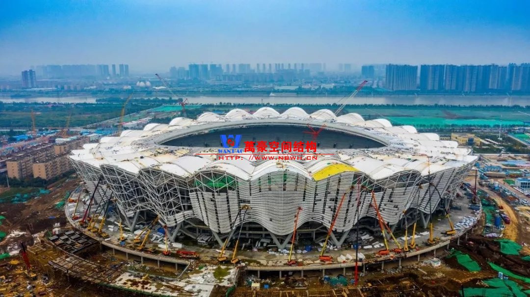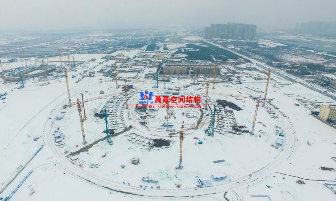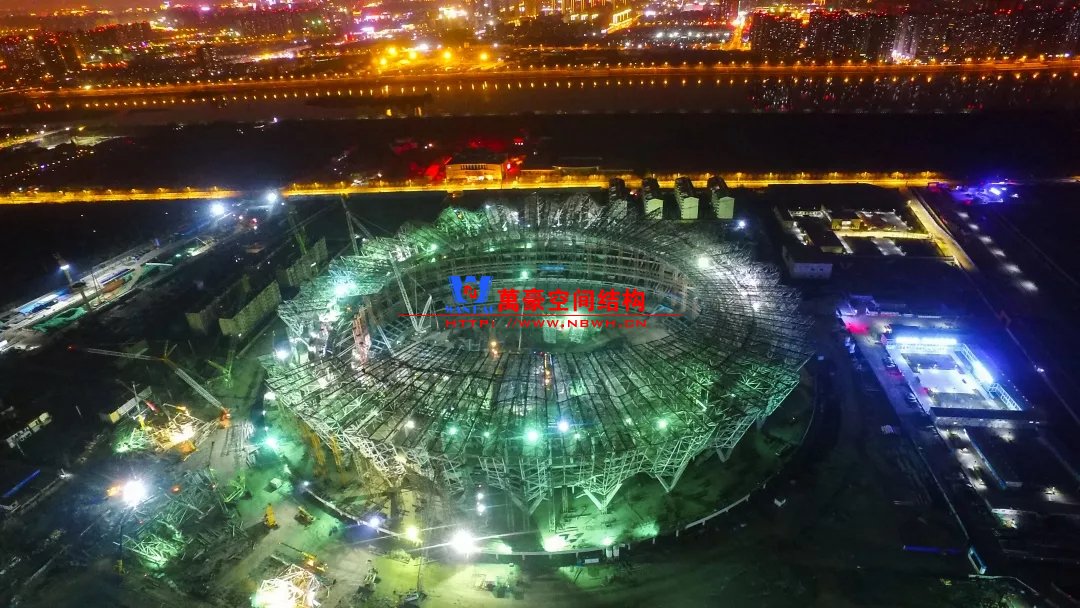 体育场罩棚整体造型呈马鞍形,采用空间管桁架悬挑结构体系,南北长332m,东西宽316m,罩棚最高58.3m。2019年1月1日首吊,钢结构分包中建钢构历时87天,消耗近5万工日、逾5千机械台班,完成168单元、9500吨罩棚钢桁架吊装工作,于3月28日提前合拢。