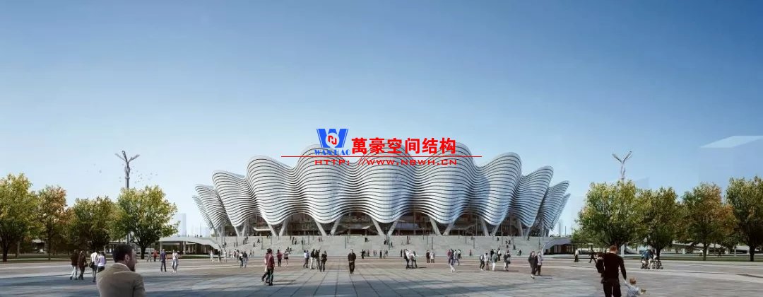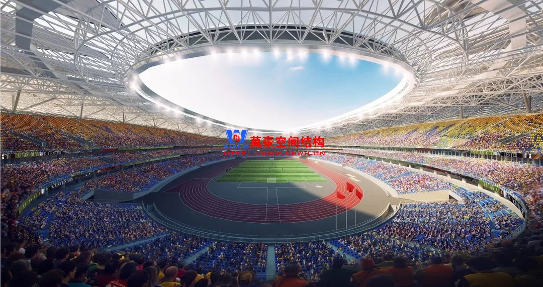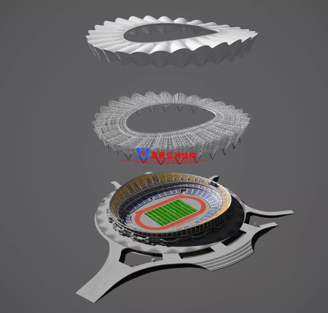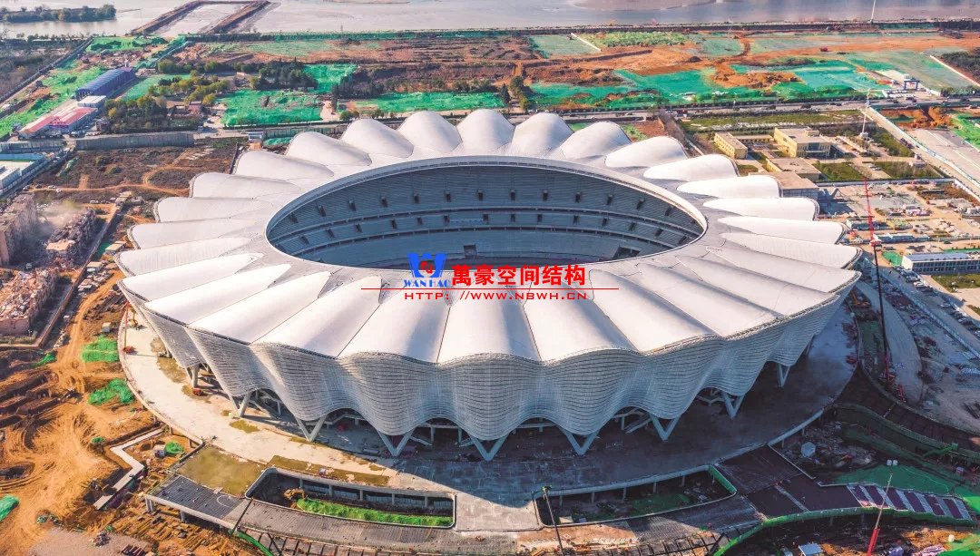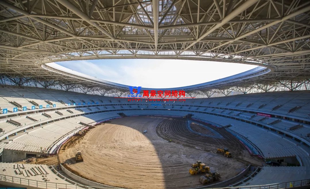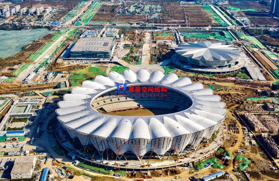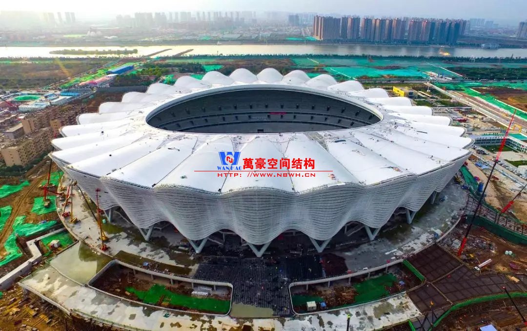 体育场主体建筑为南北长332m、东西宽316m的椭圆形,钢结构罩棚最高处高58.3m,最低处高42.6m;中间开口南北长200m、东西宽153m。主体钢结构采用空间悬挑钢桁架结构,由28个V形柱支撑72片钢结构管桁架,整体东西高,南北低,呈马鞍形,体育场看台为框架-剪力墙体系。屋顶围护结构为铝镁锰直立锁边金属屋面,罩棚立面采用银白色穿孔铝板幕墙系统,通过有韵律的变化,表达了丝绸飘舞的动感,轻盈通透的罩棚在夜晚能够透出赛场内热烈的赛事气氛,宛如皓月长空下绽放的盛世之花。碗型看台分为上、中、下三层座席,并在中上层看台之间设置包厢层(包括66个大小包厢)及其座席区,观众分别由各层看台对应的通道进入。