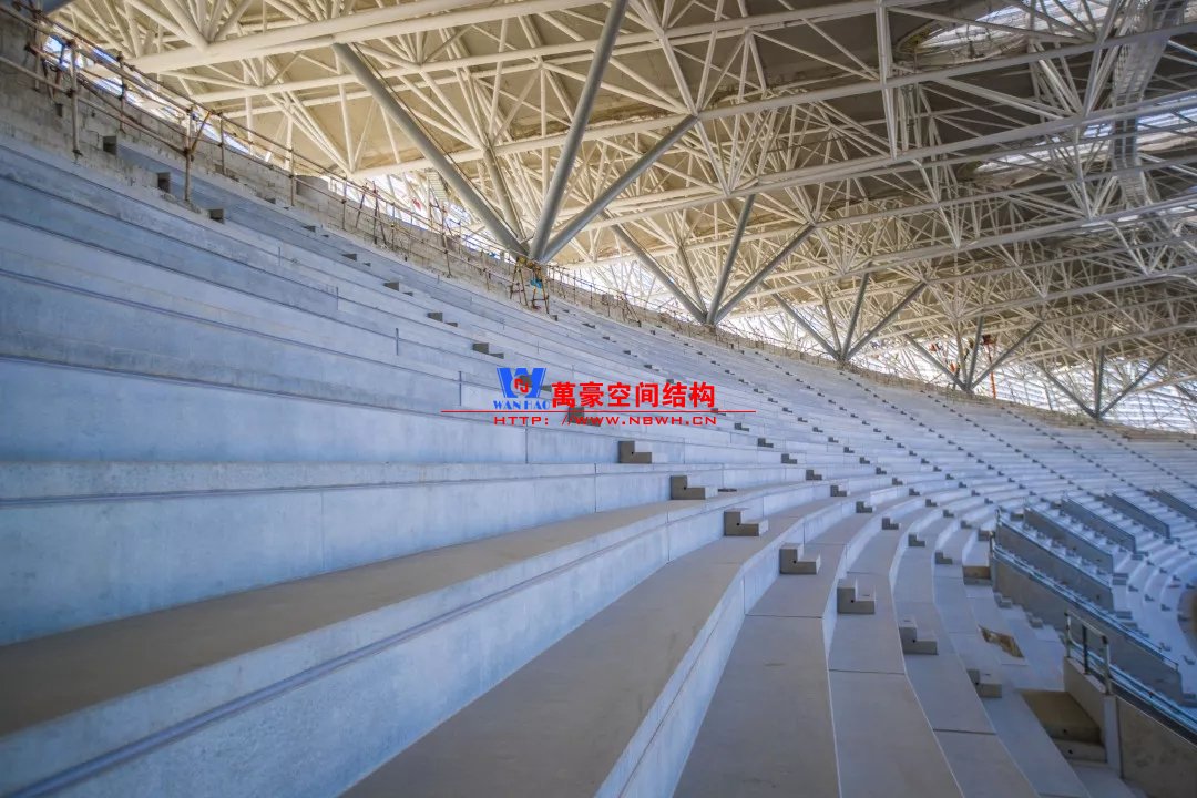 体育场6万个座位的看台全部采用清水预制混凝土,2018年6月30日首吊,采用3台大型履带吊24小时连续吊装,60天完成8848块不同看台板吊装、定位。