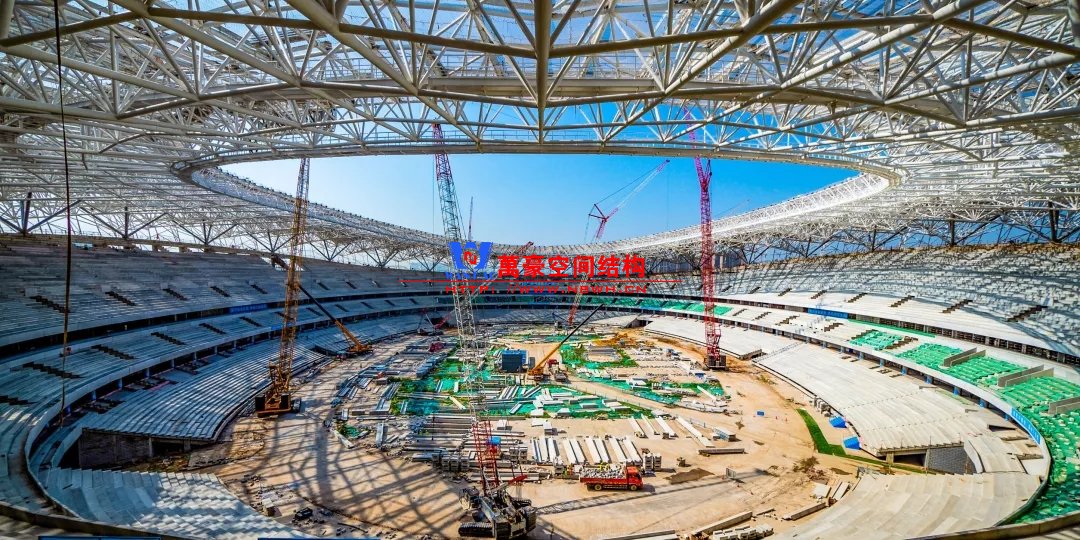 体育场屋面工程由展开面积55000㎡的异形双曲金属屋面板,和内环8000㎡的阳光板拼接而成,施工单位中建二局安装公司2019年3月11日进场后,立即展开与钢结构工程穿插施工。施工高峰期,近600名作业人员与11台大型机械(其中260吨履带吊3台,150吨履带吊3台,25吨汽车吊1台,5吨叉车4台)同场有序作业,实现屋面区域全覆盖施工。