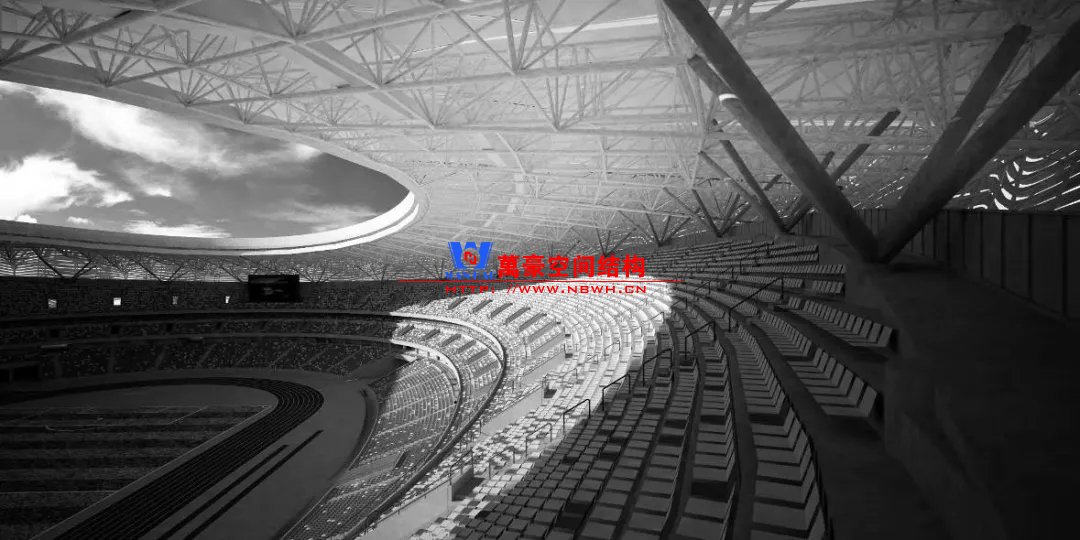 体育场罩棚采用设置前后两处支撑点,分别为看台最后排钢结构支撑柱与二层室外平台处的超大型V型钢筋混凝土支撑柱,结构逻辑清晰合理,既保证了结构的安全性,又实现了美观的建筑效果,巨大的V型柱与柔和的立面铝板线条形成强烈的反差,完成了技术性和艺术性的统一。