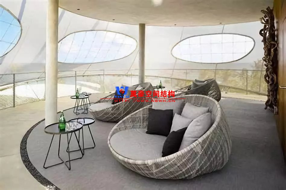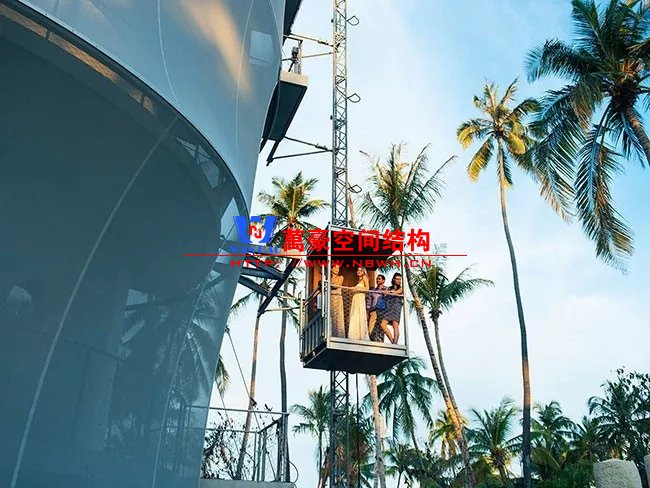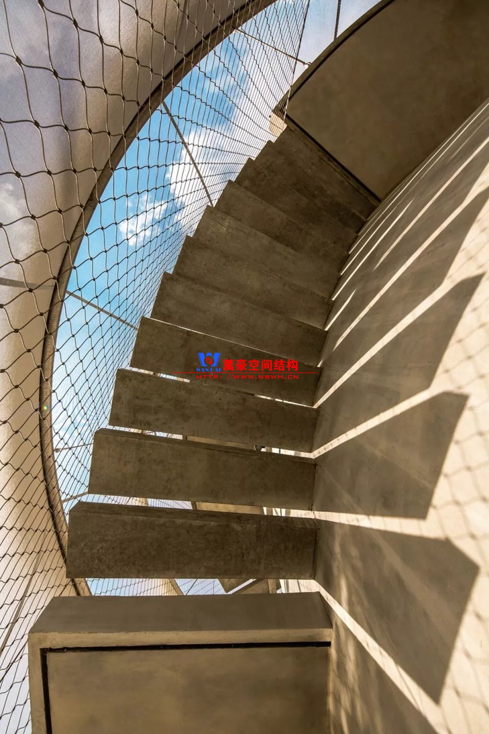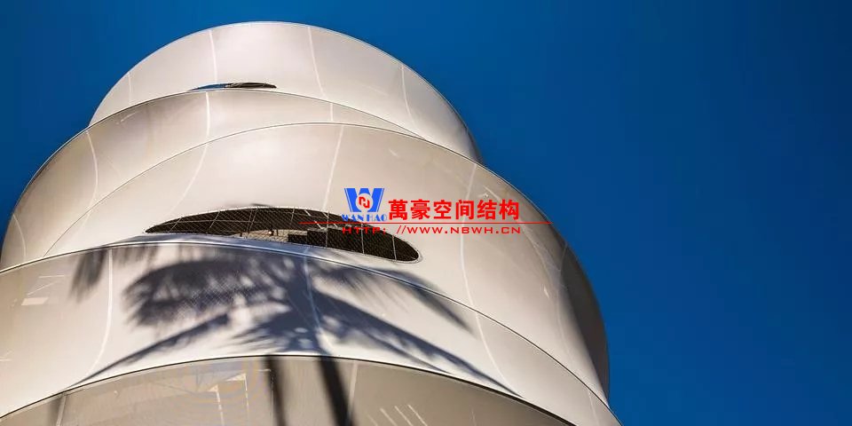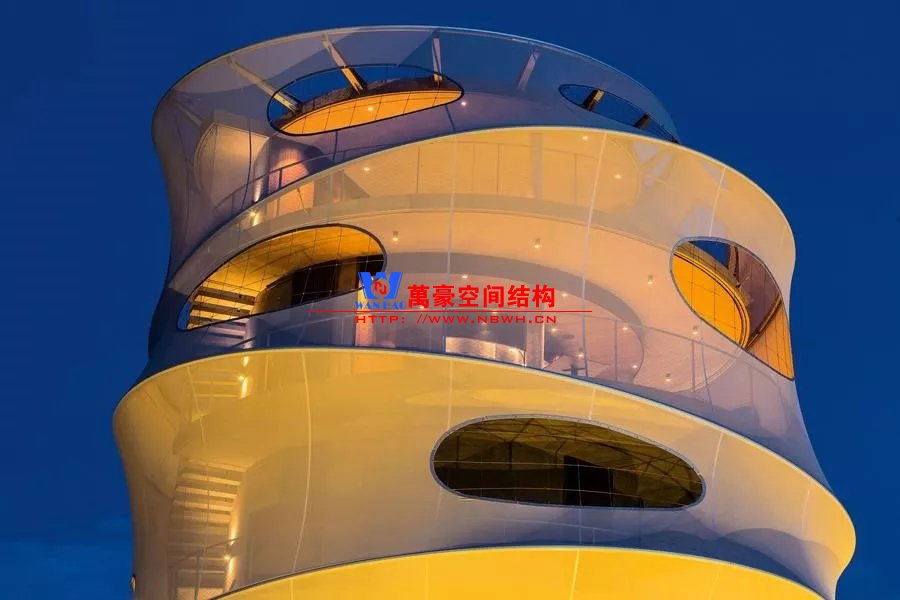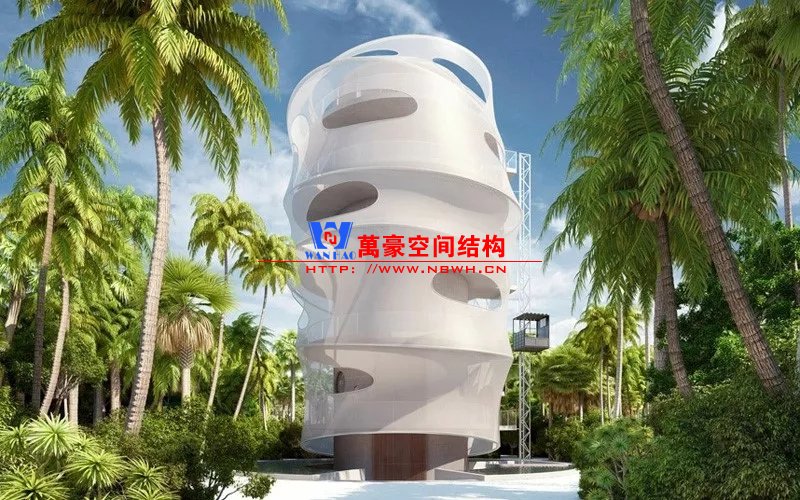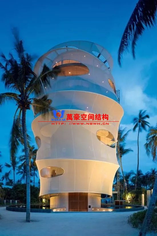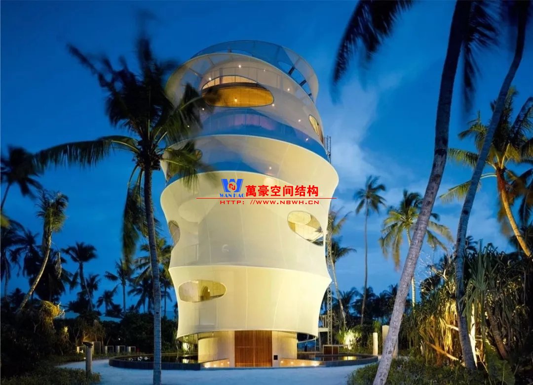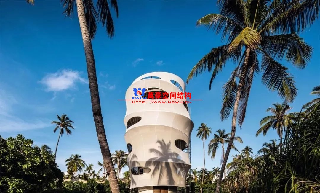 建筑师将给予这座建筑的许多种不同的期待完美统一的实现出来。在马尔代夫的地理环境中,它是独一无二的,它给予到访者的体验也是独一无二的。这座建筑摩登、先锋又颇具“野性”。 与岛上其他传统的“塔瓦鲁”风格建筑不同,由于其高度为23米,并且采用特殊结构,目前的结构在岛上占主导地位。建筑物的正面使用了钢筋混凝土整体结构,而不是传统的天然材料。它用作支撑管,由各个预制台阶制成的控制台楼梯围绕该支撑管旋转。外围的所有元素都被遮盖在浅灰色半透明的法拉利381网孔膜中,遮阳隔热,又不影响视觉通透性。