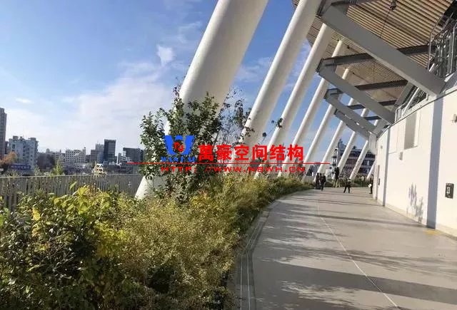 位于场馆5层的环绕式室外走廊被称为“空之森林”。这里总长度为850米,距离地面20米,种植了不同种类的植物,错落有致,宛若一座空中花园,与周围神宫外苑的“大地森林”相呼应。场馆周围栽种了约4.7万棵植物,建筑物本身使用了来自日本47个都道府县的木材。