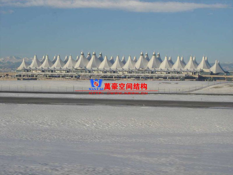 脊谷式膜结构是在两高点之间布置相互平行的脊索、在两低点之间布置谷索,高低相间,曲面呈波浪形;脊索和谷索之间的膜面形成负高斯曲率曲面。当结构跨度较大或荷载较大时,还可在脊索和谷索之间适当布置一些横向的加强索。脊谷式膜结构的结构平面多呈矩形。美国的丹佛国际机场和加拿大的 Canada Place等,都是典型的脊谷式膜建筑。
