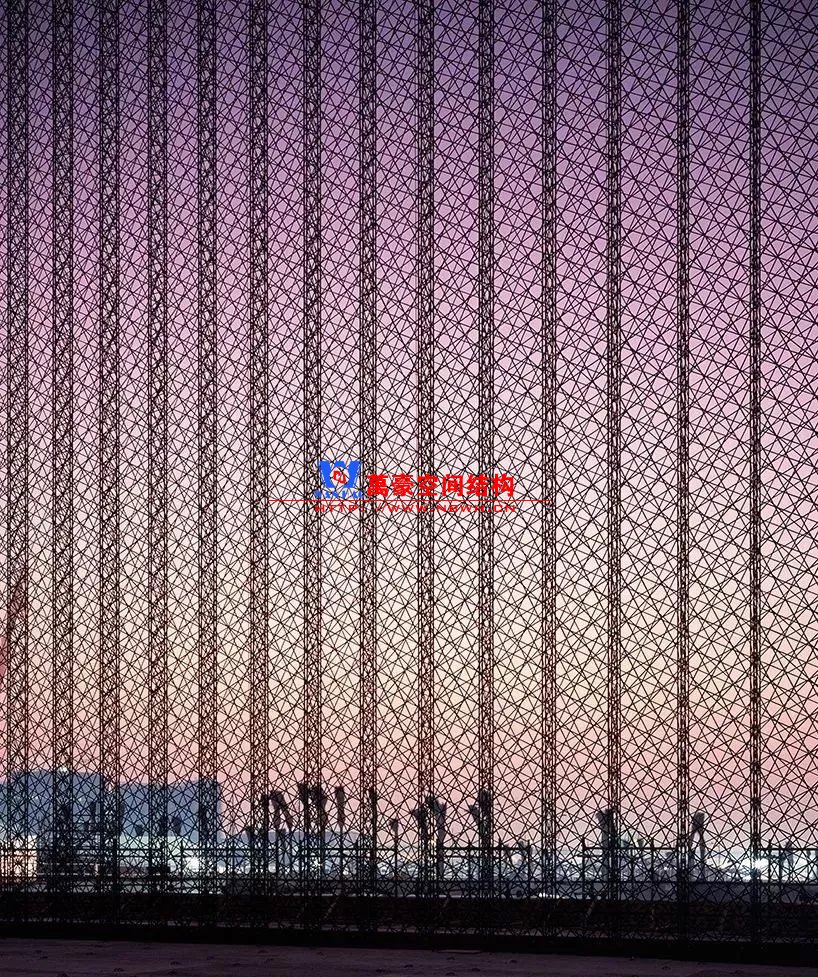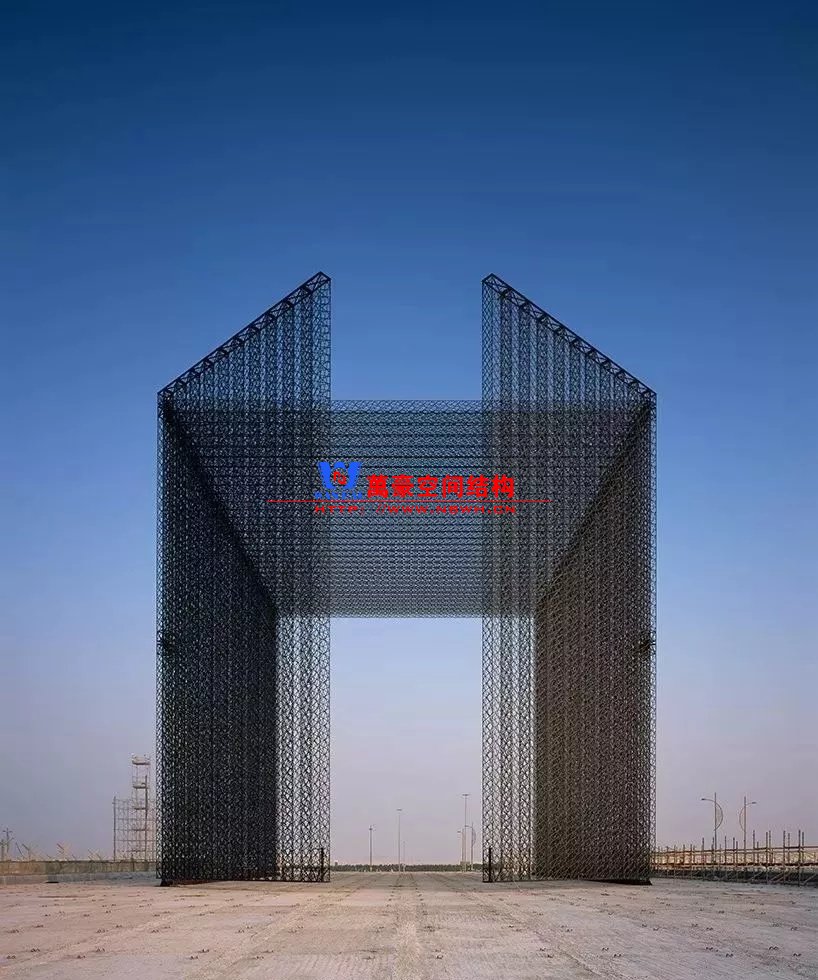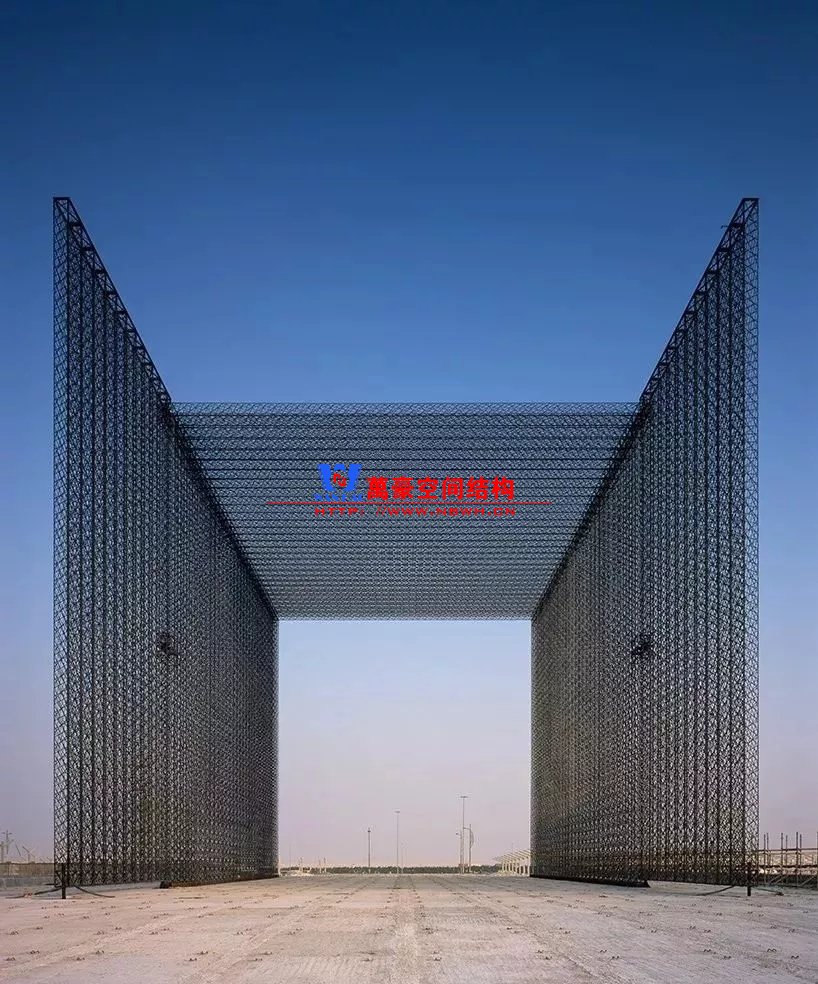这三座大门完全由超轻的碳纤维混合丝编织而成,具有很高的结构强度。事实上,这使得每一扇大门在无额外支撑的情况下能达到21米高,30米长。每一座大门有两扇巨大的门构成——21米高,10.5米宽,将在2020世博会期间的每个清晨打开以迎接从世界各地来的游客。它们被分别置于场地的三个区域——机遇、移动和可持续性,而且,一旦进入,人们将被引导至树木葱郁的到达庭院,该庭院同样是由 Asif Khan 设计。