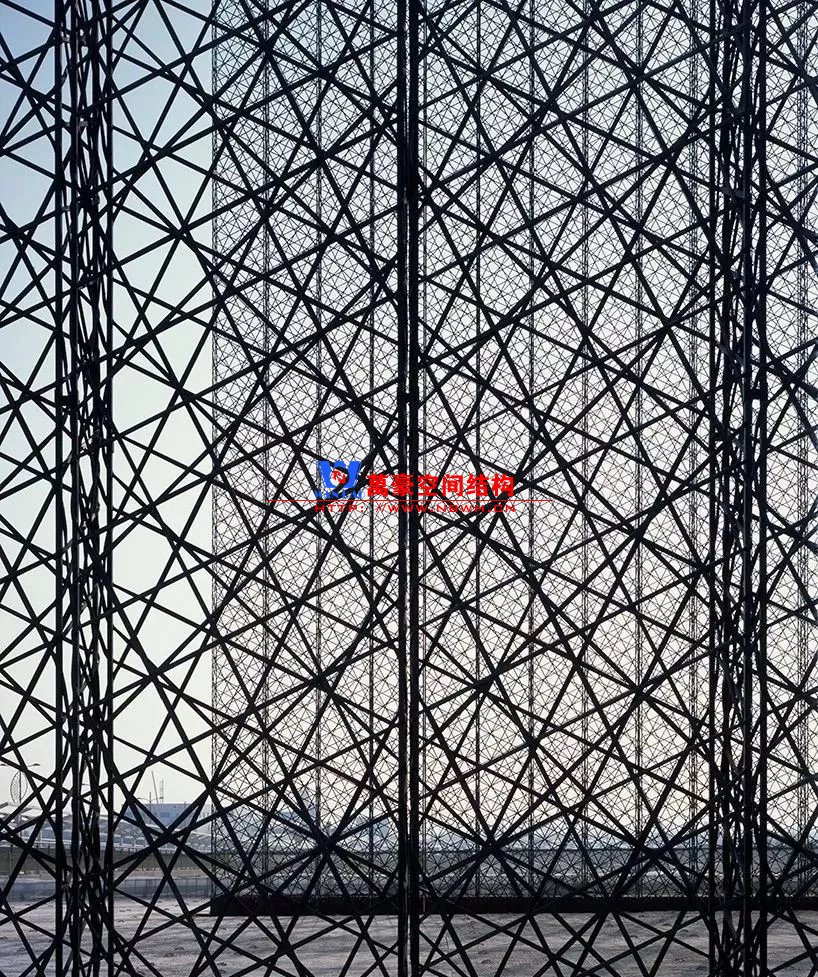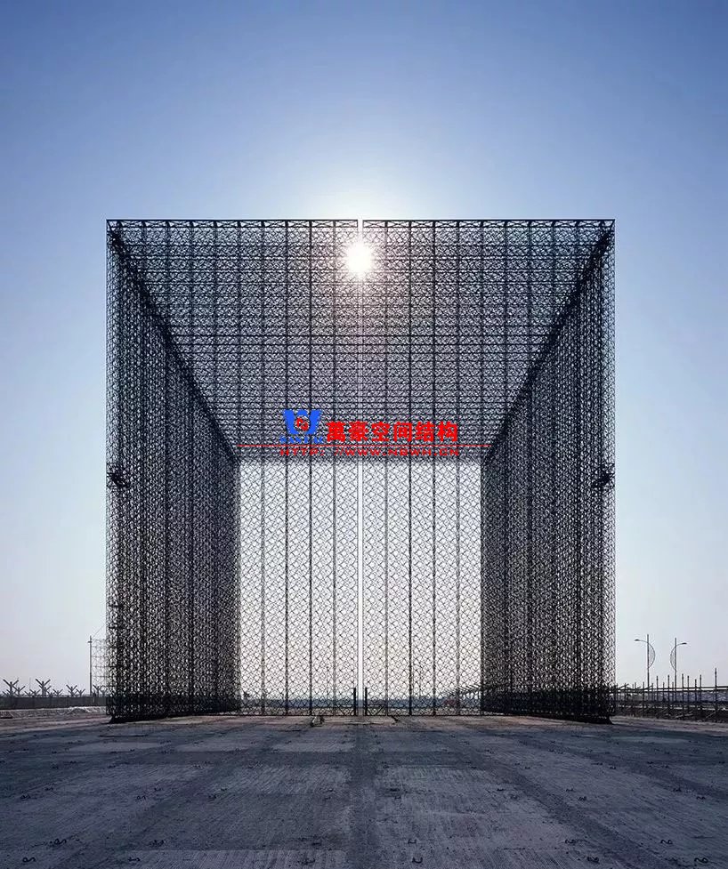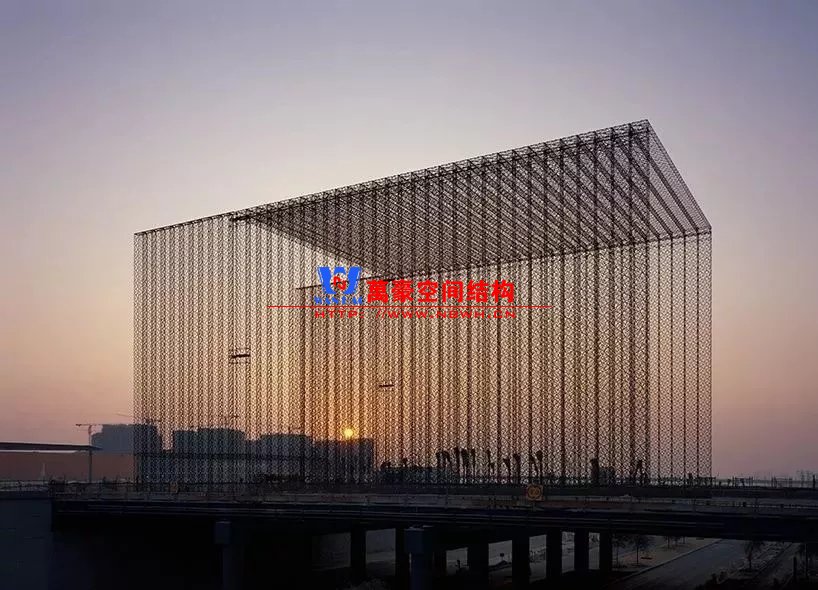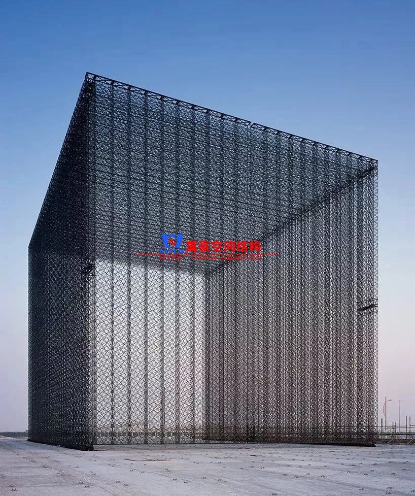 在2020迪拜世博会入口大门的设计上,Asif Khan将传统窗花,一种该地区广泛使用的用于调节阳光和空气流通的精细设计,进行了未来主义的适用。黑色蕾丝形式的立方体同时创造出神秘的黑暗空隙,凑近看时,会渗透进更多的光线。“编织物”在蓝天下描绘了一幅图案鲜明的壁画,同时也在场地上投射出镜像的阴影,代表着一种艺术化的,建筑形式的,本土化的欢迎客人的方式。