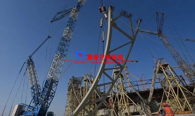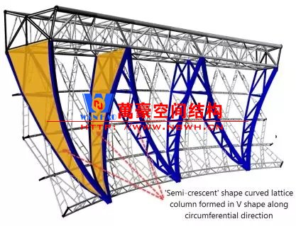 卢赛尔体育场外形就像一个硕大的“金钵”,其主体及看台钢结构总用钢量约3万吨,相当于三个埃菲尔铁塔的重量。V柱是项目主体钢结构的重要组成部分,总重量约为6271吨,是“金钵”主要的竖向传力系统,为压环以及幕墙侧壁结构提供支承,并将竖向力传递到混凝土柱墩上,进而传递到地面。