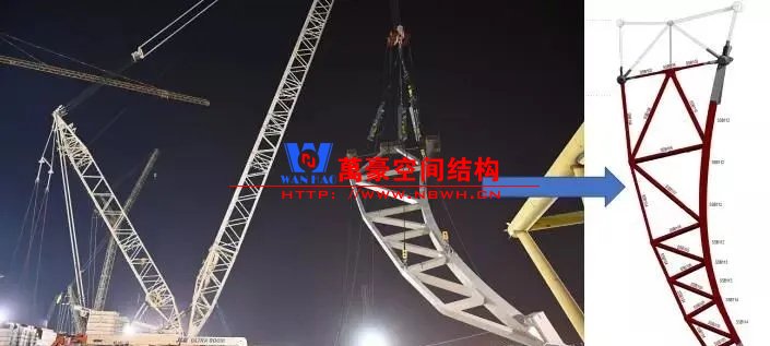 项目共有48榀单V柱,总重量约为6271吨,此次吊装的单V柱重量约147吨,长度约48米,顶部宽约15.5米,是卢赛尔体育场最大的V柱。从5月9日上午8时到5月10日凌晨2时,吊装持续进行。在吊装过程中,现场3名技术员负责遥控千斤顶来控制吊绳长度,确保V柱的空中顺利转体;4名装配工负责支座与V柱柱脚的螺栓连接,保障最终的吊装就位。该项目总工程师李白、项目副经理马高峰等管理人员一直蹲守现场,随时进行现场调度。