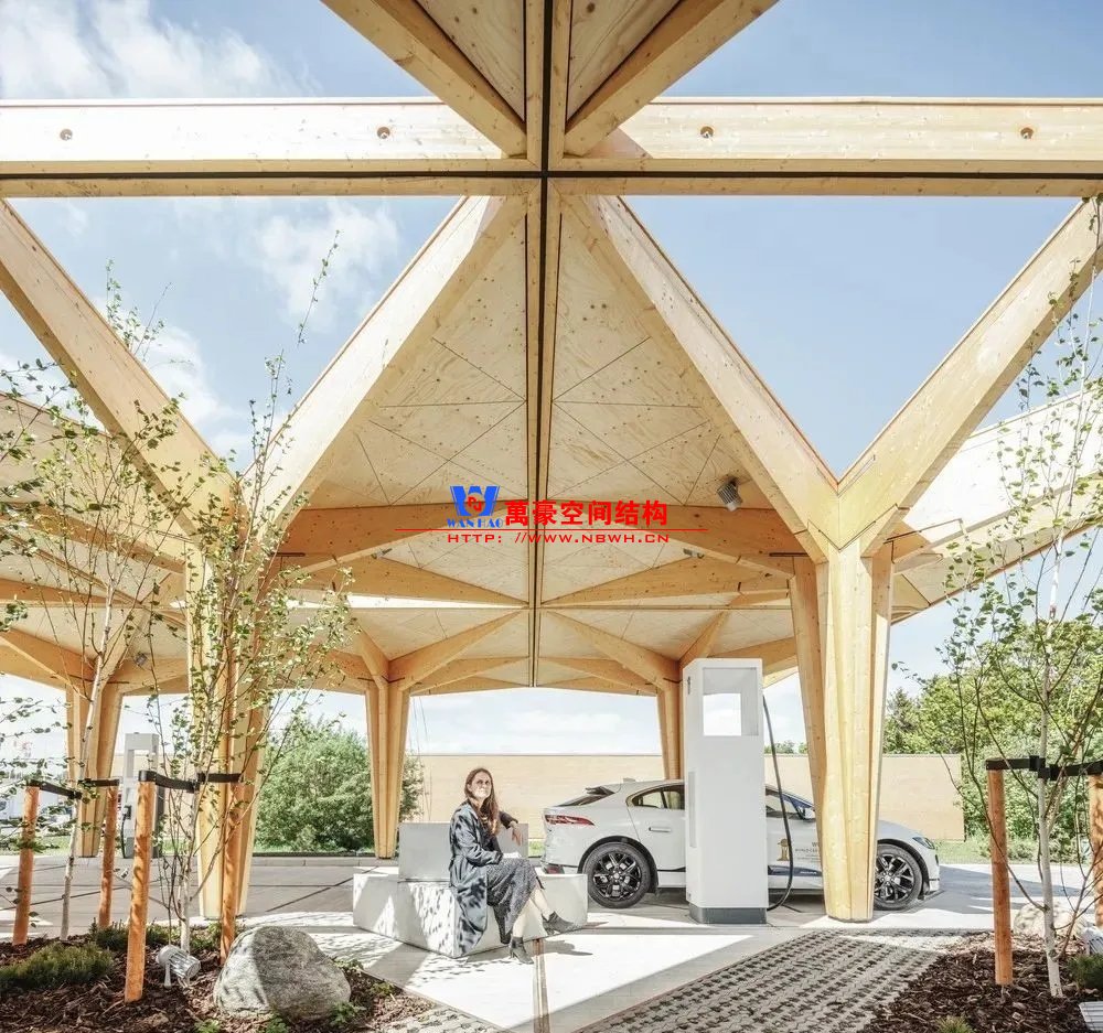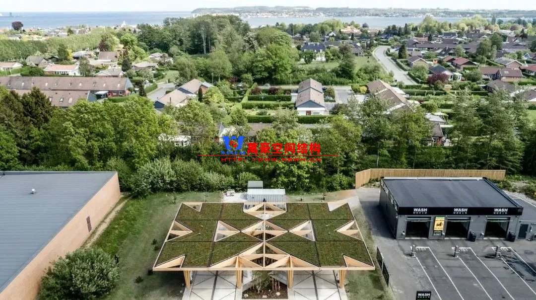 由于模块化的设计理念,车站是可伸缩的,一颗 “树” 可以根据需要轻松地变成一个完整的 “树林”。充电站由有认证的木材和混凝土建造,顶部是太阳能电池板,周围是与丹麦自然保护协会合作选择的树木、草和其他植物,目的是加强车站周围的生物多样性。 建筑的所有组成部分都可以被分解成可用的和可回收的材料,选择木材作为建筑材料进一步强调了建筑的可持续设计。