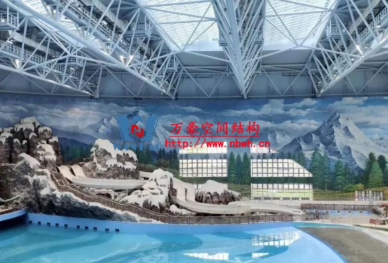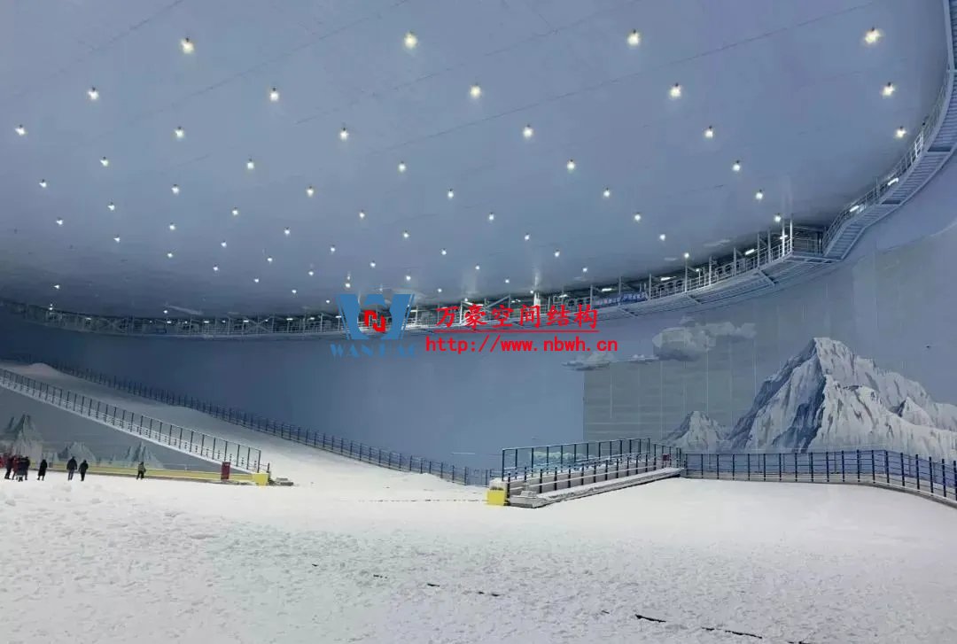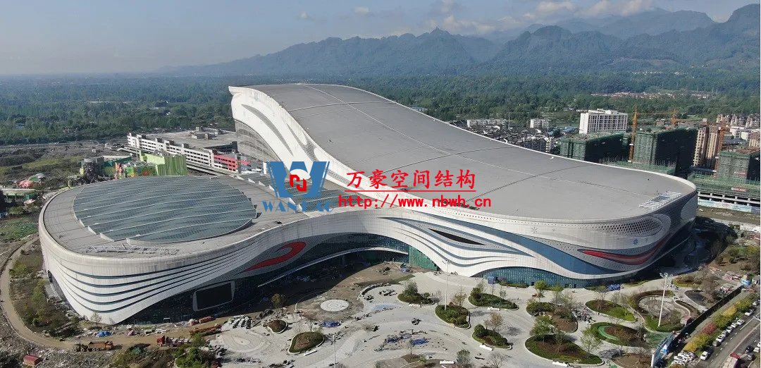 成都融创文旅城水雪综合体项目是成都融创文旅城的核心主体建筑,主要由雪世界、水世界和停车楼组成,总建筑面积36.76万平方米,水雪综合体项目用钢量约2.4万吨。其中,雪世界最大长度达428米,跨度由174米渐变至94米,地下2层、地上5层,整体结构立面高度最低35米,最高85米,是全国最大钢筋混凝土结构室内滑雪场。