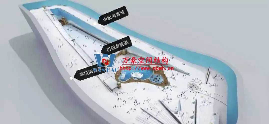 水雪综合体用钢量达到2.4万吨,雪世界最长滑雪道有320米,垂直落差达60米,相当于20层楼高。
