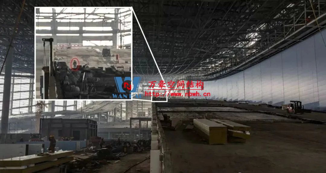 水雪综合体高中低三区屋盖,需要采用不同的安装方式。低区屋盖直接在地面拼装,然后再吊装就位;中区屋盖需要采用原位拼装+整体累计提升的方式;高区屋盖则采用累积滑移+局部提升的方式,沿滑雪道布置两条大滑梯,地面拼装后再将钢材部件顺着滑梯滑上去,到达固定位置时对接安装好完成。